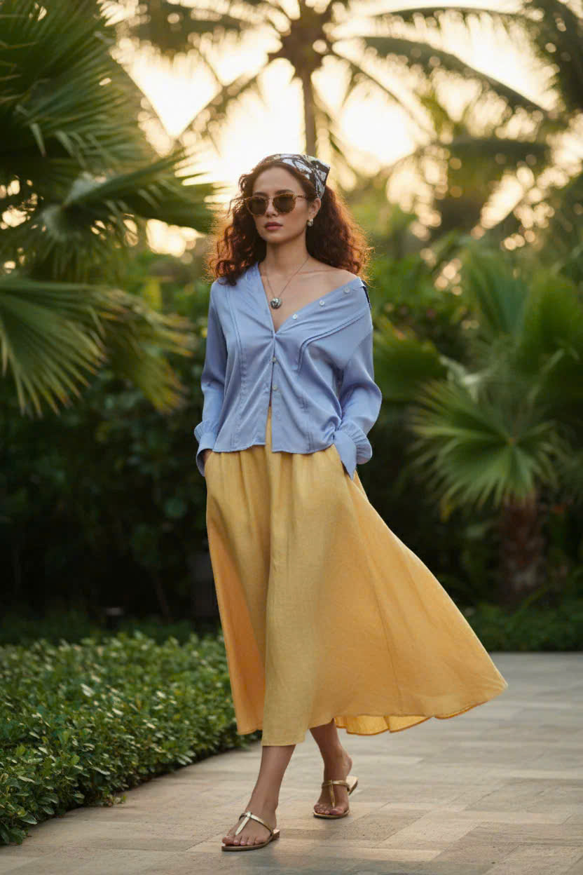 - Công sở hiện đại: Kết hợp hoàn hảo với chân váy linen màu vàng Golden Sand để tạo nên bộ đôi tương phản nổi bật. Sơ vin áo gọn gàng để khoe vòng eo và tạo phom dáng thon thả.