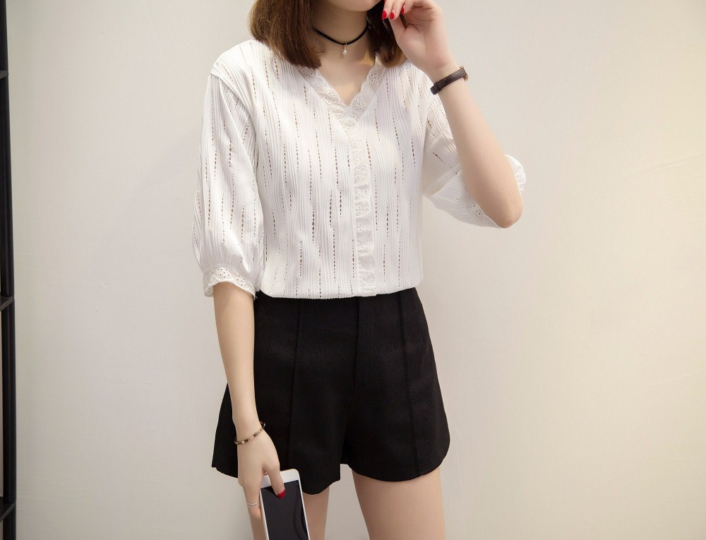 ✨Áo sơ mi nữ công sở cổ V thanh lịch, họa tiết trơn phối viền ren siêu xinh, phong cách Hàn Quốc HB185