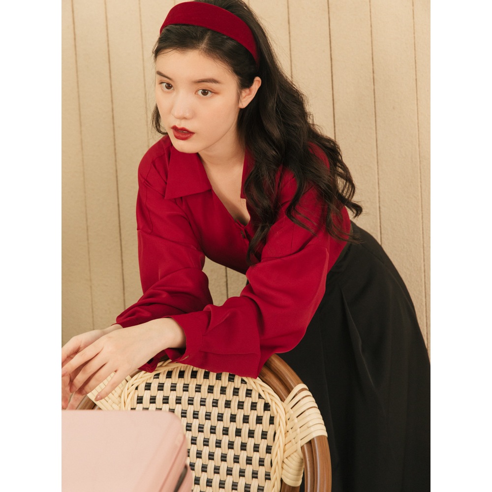 - Áo sơ mi nữ dài tay form rộng dài, cổ áo sơ mi lạ mắt tạo kiểu.