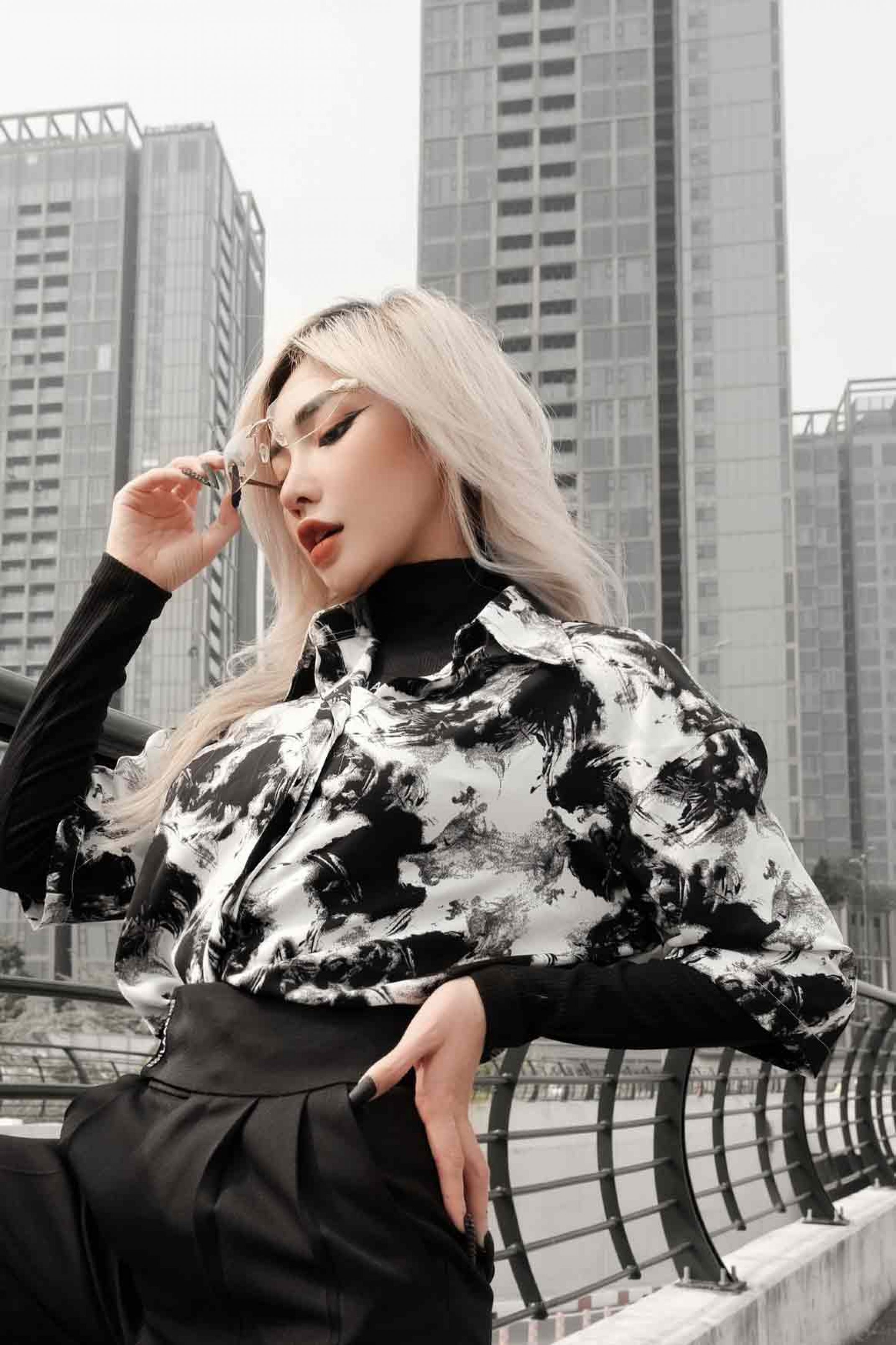 CHẤT LIỆU MANGO, MỀM MƯỢT, KHÔNG NHĂN ÁO MÀU TRẮNG, HOẠ TIẾT MÀU ĐEN ÁO SOMI NẸP GIẤU NÚT FORM RỘNG FREESIZE ĐIỂM NHẤN 1 BÊN TAY PHẢI ÁO GẮN TAG LOGO LAAS