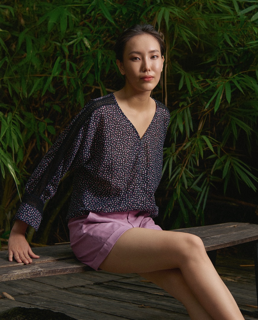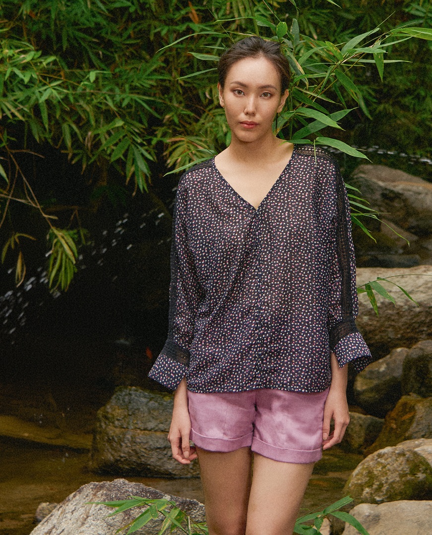 Nổi bật cùng chiếc áo suông tay phối ren, mang họa tiết in chấm nhỏ li ti tựa những vì tinh tú lấp lánh trên bầu trời đêm, tạo nên sự kết hợp hài hòa giữa phong cách cổ điển và hiện đại. Chiếc áo được thiết kế với kiểu dáng thoải mái, mang lại cảm giác nhẹ nhàng, dễ chịu khi mặc. Phần tay áo được phối ren tạo điểm nhấn, thêm phần tinh tế và nữ tính cho trang phục.