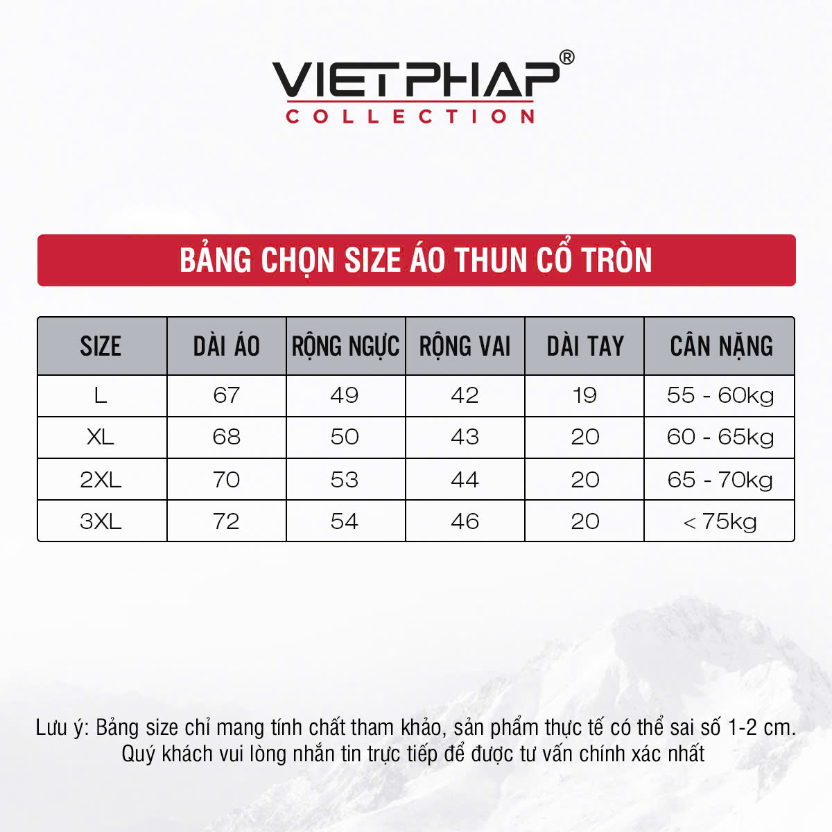 Áo Thun Cổ Tròn VIỆT PHÁP cao cấp mềm mại thoáng khí - Chất liệu: 98%cotton, 2% spandex - Size: L - XL - 2XL - 3XL - Màu: 5 màu - Kiểu dáng: Màu sắc basic thanh lịch và