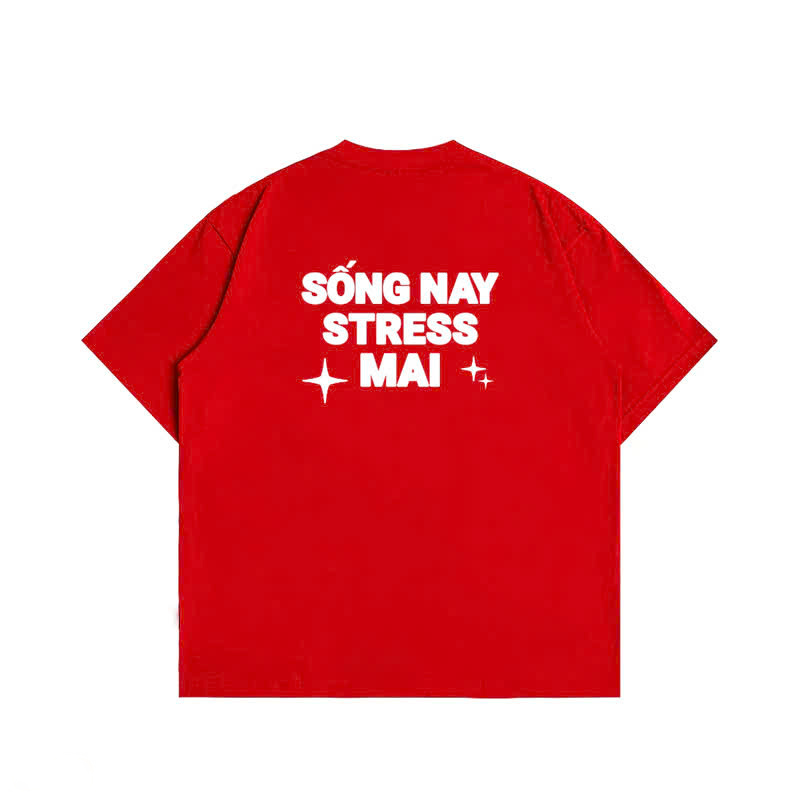 - Thiết kế in chữ "SỐNG NAY STRESS MAI" nổi bật trên nền áo tạo điểm nhấn độc đáo, giúp bạn thể hiện phong cách sống tự tin, vui tươi, và không quá lo nghĩ về những áp lực thường nhật.