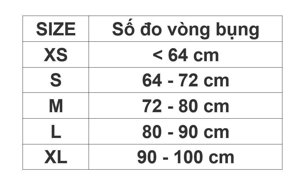 Quý khách vui lòng chọn size theo vòng bụng Size S: 50 - 65 cm Size M: 65 - 80 cm Size L: 80 - 95 cm Size XL: 95 - 110 cm Size XXL: