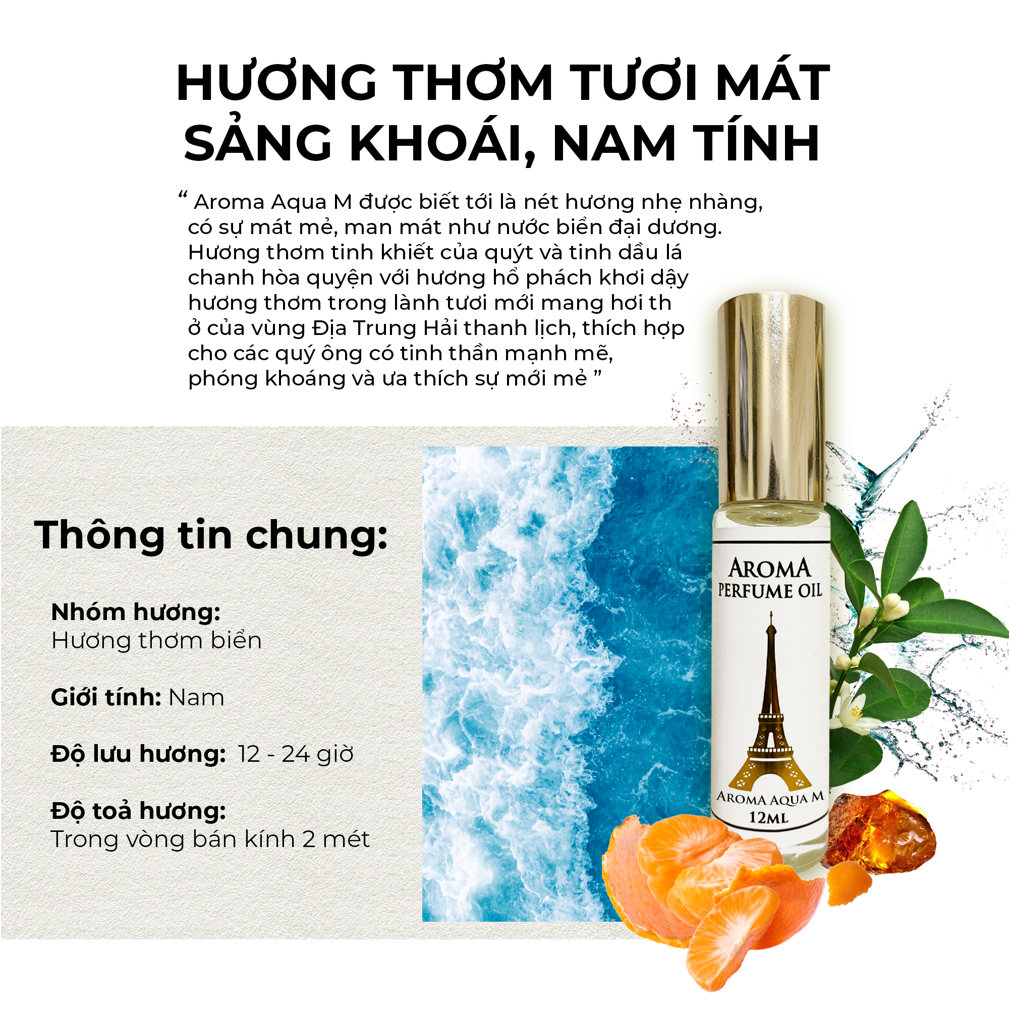 • Tinh dầu nước hoa nam Aroma Aqua M gây ấn tượng với mùi hương nhẹ nhàng, man mác trong lành như nước biển. Mang đến cảm giác tràn đầy hứng khởi. Hương thơm xuất hiện ở tầng đầu tiên là mùi của tinh dầu lá cam, quả cam và quýt hồng.