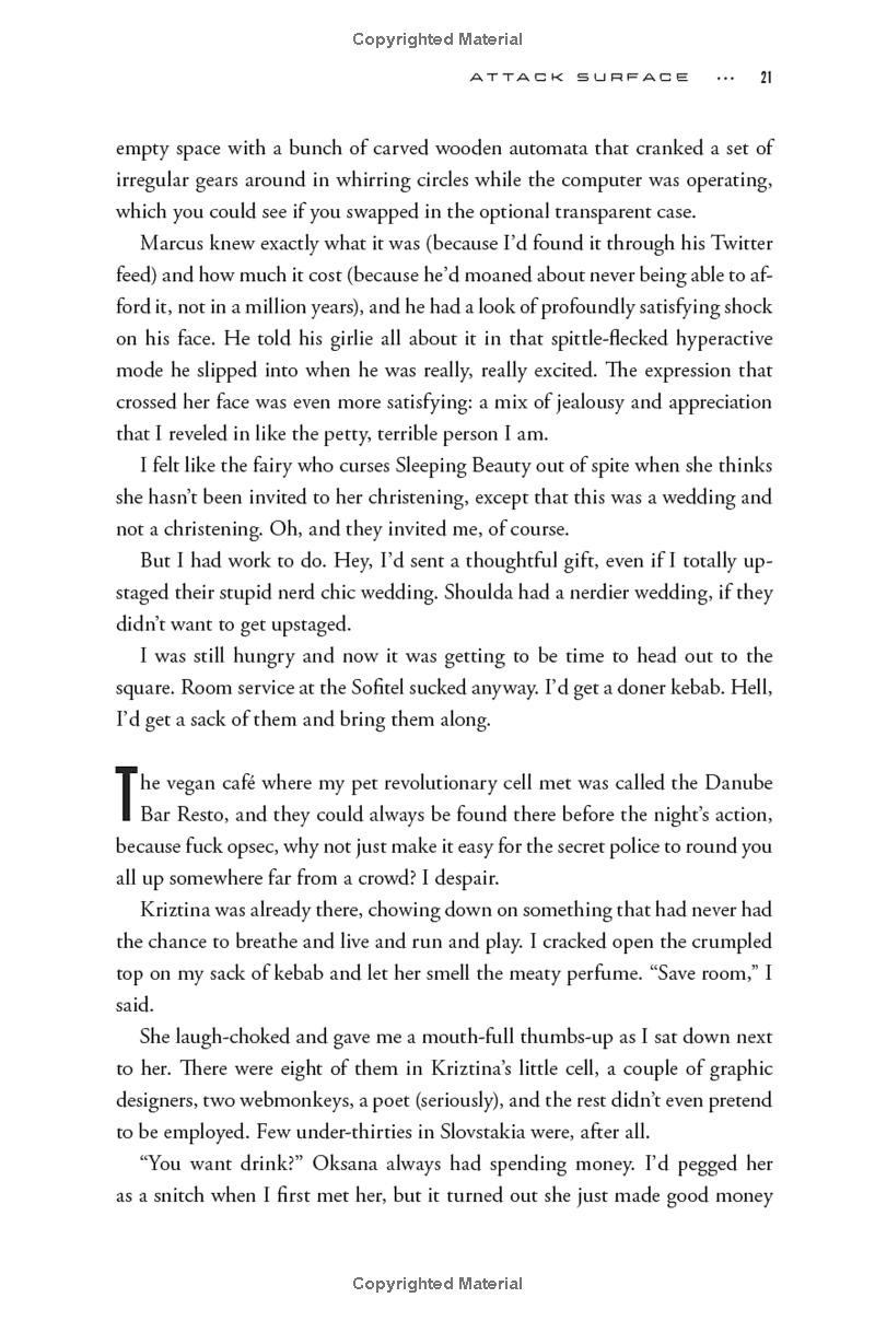 Attack Surface Return to the world of Little Brother and Homeland. Attack Surface takes us five minutes into the future, to a world where everything is connected and everyone is vulnerable. Masha Maximow has made