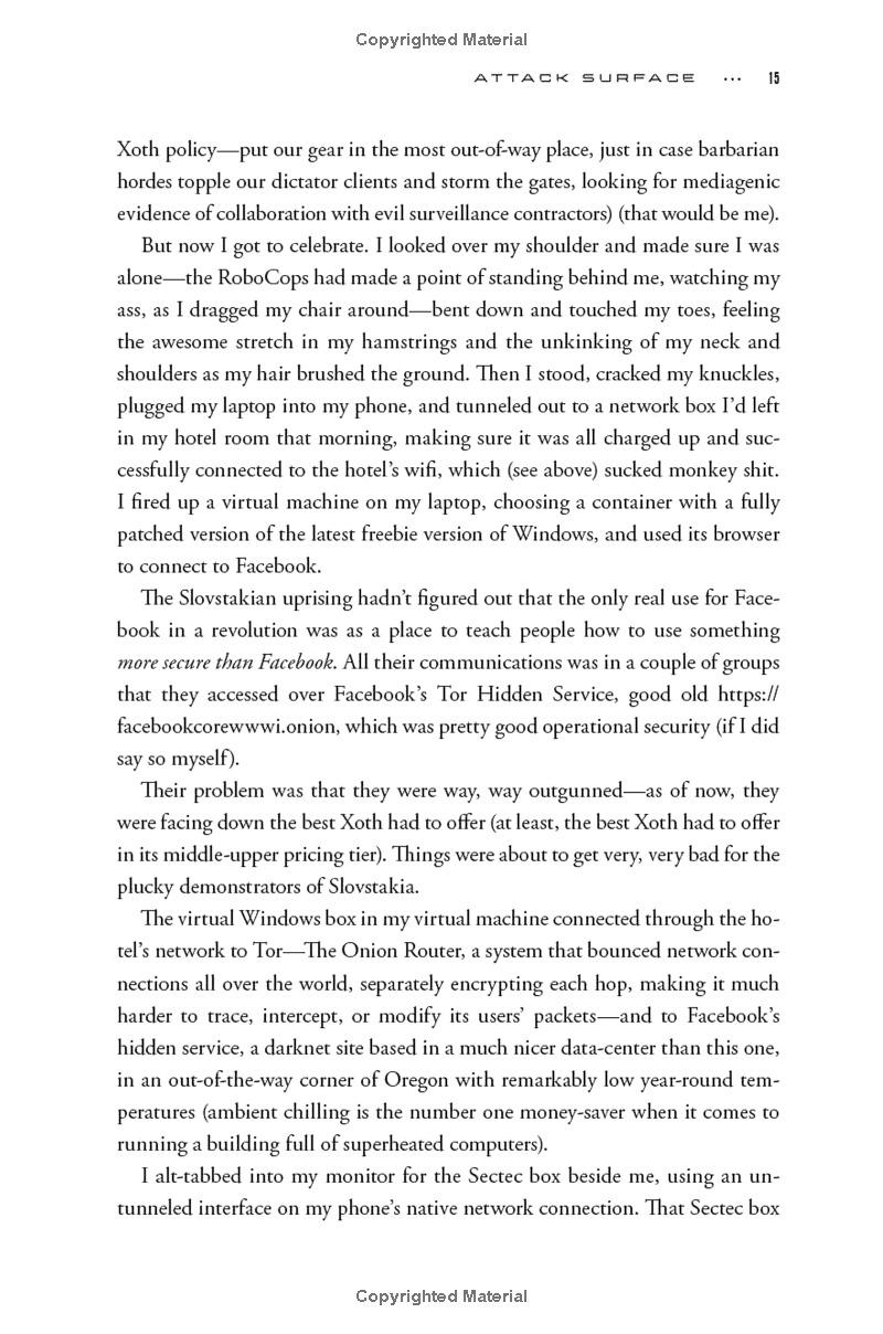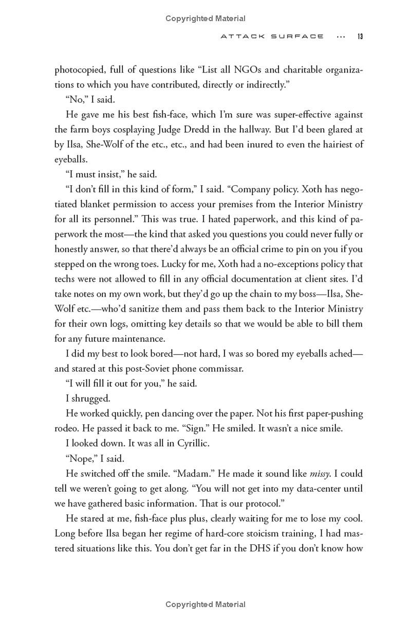 Masha works for Xoth Intelligence, an InfoSec company upgrading the Slovstakian Interior Ministry's ability to spy on its citizens' telecommunications with state-of-the-art software (at least, as state-of-the-art as Xoth is prepared to offer in its middle-upper pricing tier).