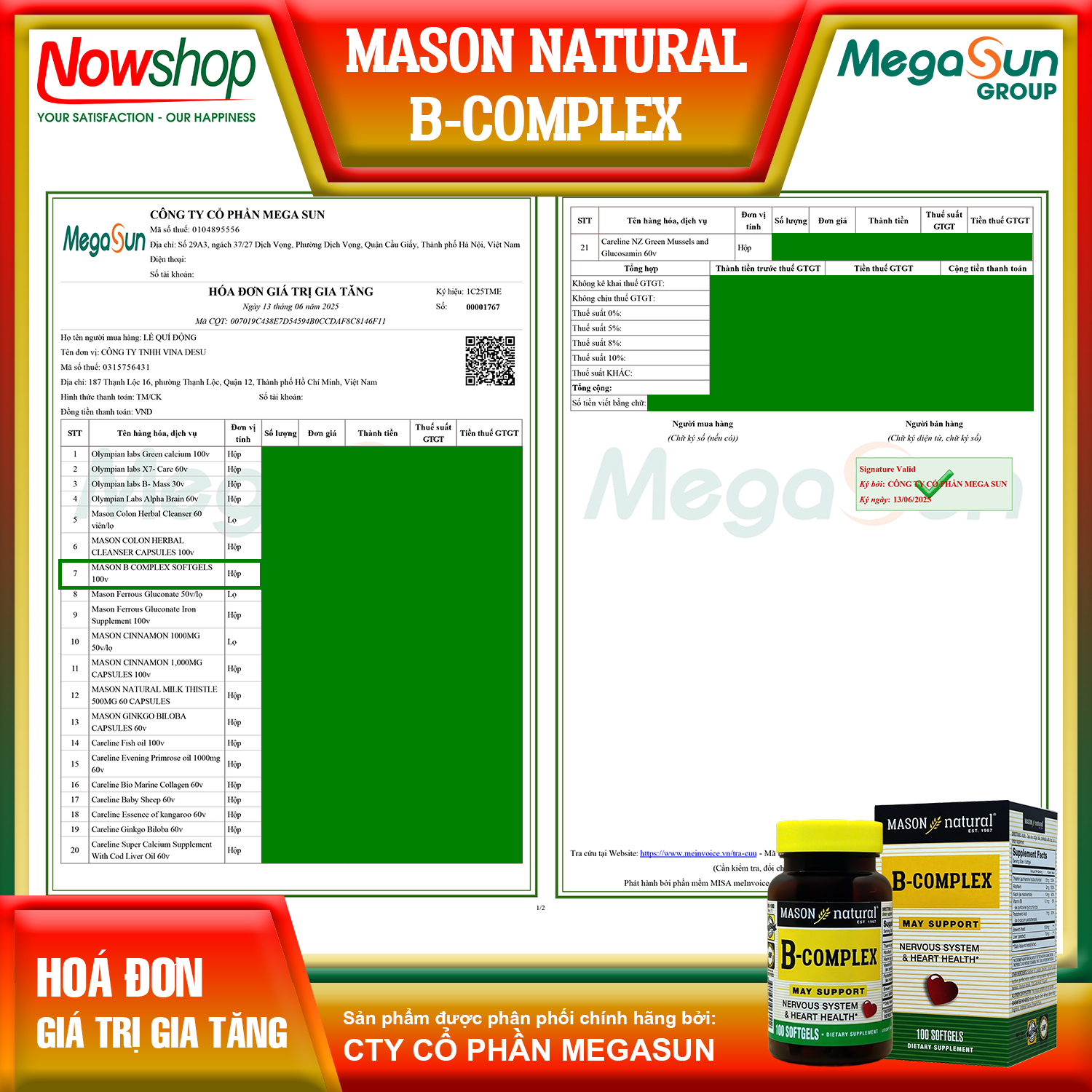 Mason B-Complex - Bổ sung Vitamin B toàn diện - Duy trì trí nhớ, giảm mệt mỏi, tăng tập trung Công thức chuẩn Mỹ - Hấp thu nhanh, hiệu quả lâu dài, an toàn cho sức khỏe Tăng năng lượng mỗi ngày - Duy trì thể lực & tỉnh táo suốt ngày dài Bổ não – Giảm stress - Hỗ trợ trí nhớ & thần kinh khỏe mạnh Tăng miễn dịch - Bảo vệ tim mạch ️ - Khỏe từ trong ra ngoài Viên nang nhỏ - dễ uống - tiện sử dụng hàng ngày Mason Natural - Thương hiệu Mỹ hơn 50 năm uy tín - Đạt chuẩn GMP     Xuất xứ: Mỹ Quy cách đóng gói: Hộp 100 viên     THÀNH PHẦN Trong 1 viên nang mềm (640mg + 7.5%): ️ Vitamin B1: 1.5mg ️ Vitamin B2: 2mg ️ Niacin: 10mg ️ Vitamin B6: 0.1mg ️ Pantothenic acid: 1mg ️ Men bia: 100mg️ Gan Gan động vật (đã tách mỡ): 70mg     CÔNG DỤNG NỔI BẬT Cân bằng chế độ dinh dưỡng - Giúp ăn ngon miệng, tăng hấp thụ Giảm mệt mỏi, phục hồi sức khỏe cho cơ thể Hỗ trợ tăng cường trí nhớ, giảm căng thẳng, cải thiện chức năng thần kinh ️Tăng cường sức khỏe tim mạch & hệ miễn dịch     ĐỐI TƯỢNG NÊN BỔ SUNG VITAMIN NHÓM B: Người hay mệt mỏi, uể oải, thiếu sức sống Người làm việc trí óc căng thẳng, stress kéo dài Học sinh - sinh viên học tập áp lực, thiếu tập trung Người khó ngủ, ngủ không sâu giấc, hay quên ️Người ăn uống kém, thiếu chất, suy dinh dưỡng nhẹ Người lớn tuổi, người mới ốm dậy cần phục hồi thể lực     HƯỚNG DẪN SỬ DỤNG Uống 1-2 viên/ngày cùng với bữa ăn Duy trì đều đặn để đạt hiệu quả tối ưu Uống với nhiều nước Không dùng cho trẻ em dưới 12 tuổi nếu không được hướng dẫn từ chuyên gia y tế     LƯU Ý KHI SỬ DỤNG Không dùng cho người mẫn cảm với bất kỳ thành phần nào của sản phẩm Phụ nữ có thai hoặc cho con bú, người đang dùng tân dược nên tham khảo ý kiến bác sĩ trước khi sử dụng SẢN PHẨM KHÔNG PHẢI LÀ THUỐC VÀ KHÔNG CÓ CHỨC NĂNG THAY THẾ THUỐC CHỮA BỆNH     CÁCH BẢO QUẢN Đậy kín nắp sản phẩm sau khi sử dụng ️Để sản phẩm ở nơi khô ráo, thoáng mát.Tránh để ánh nắng tác động trực tiếp lên sản phẩm     KHUYẾN CÁO Khi nhận hàng Quý Khách vui lòng đồng kiểm, quay lại video nhận và mở đơn hàng khi Shipper giao đến để thuận tiện hơn trong quá trình đổi, trả nếu có do sai sót từ Shop hoặc phía vận chuyển nhé!     ️ CAM KẾT VÀNG TỪ SHOP Sản phẩm chính hãng - Giống với mô tả - Xuất Hóa đơn giá trị gia tăng 100% Nguồn gốc rõ ràng - Giấy tờ đầy đủ theo quy định của Bộ Y Tế Đảm bảo chất lượng - Dịch vụ tốt nhất (Nhiều Voucher giảm giá kèm nhiều quà tặng hấp dẫn) Hỗ trợ tư vấn 24/7 - Đổi trả miễn phí (Khi có lỗi khách quan) Đóng gói cẩn thận - Giao hàng nhanh chóng (Nhận hàng từ 1-5 ngày kể từ khi đặt hàng tại shop)