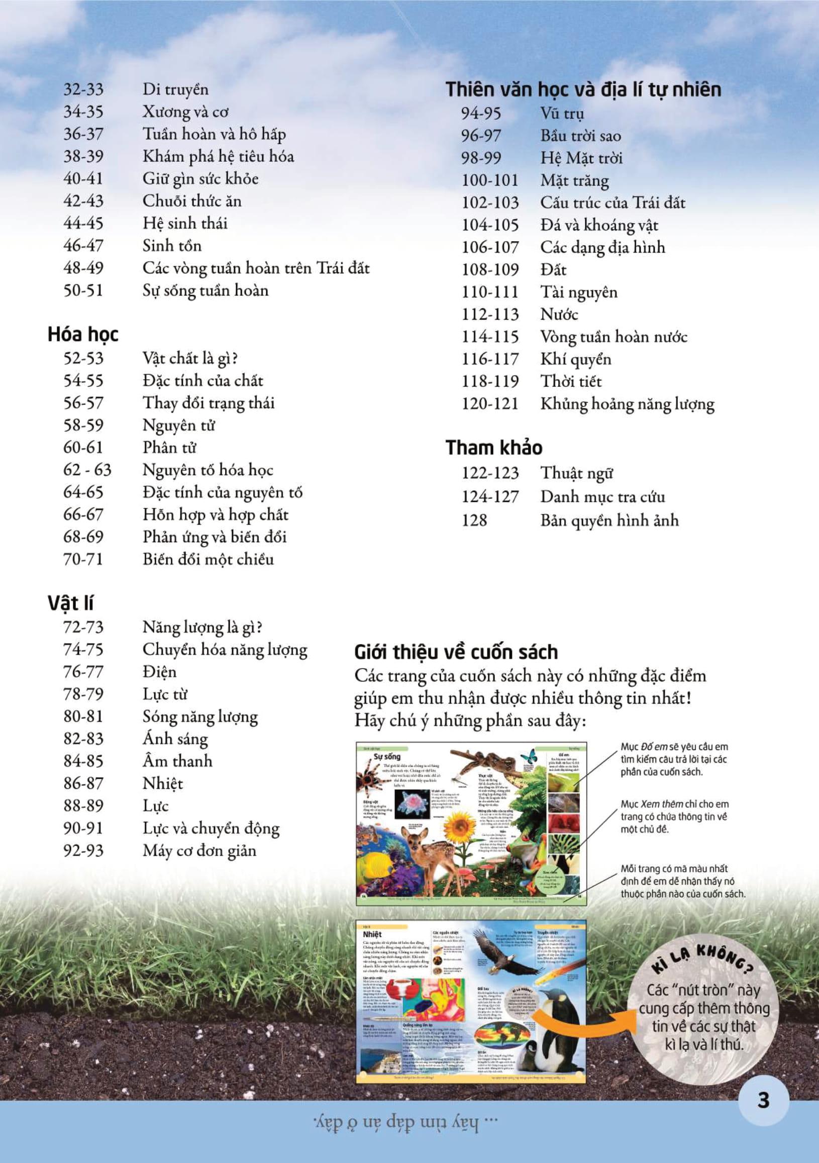 Với các hình minh họa trực quan sinh động, bắt mắt, cuốn sách cung cấp một lượng kiến thức phong phú, súc tích, dễ hiểu, cùng những câu hỏi vui, mẩu thông tin thú vị về khoa học. Em sẽ được tìm hiểu từng lĩnh vực mà khoa học nghiên cứu, từ sinh vật học, hóa học, vật lí tới thiên văn học. Bên cạnh đó, em có thể tìm trong cuốn sách các hướng dẫn và gợi ý giúp em thử làm nhà khoa học nhí nữa đấy.