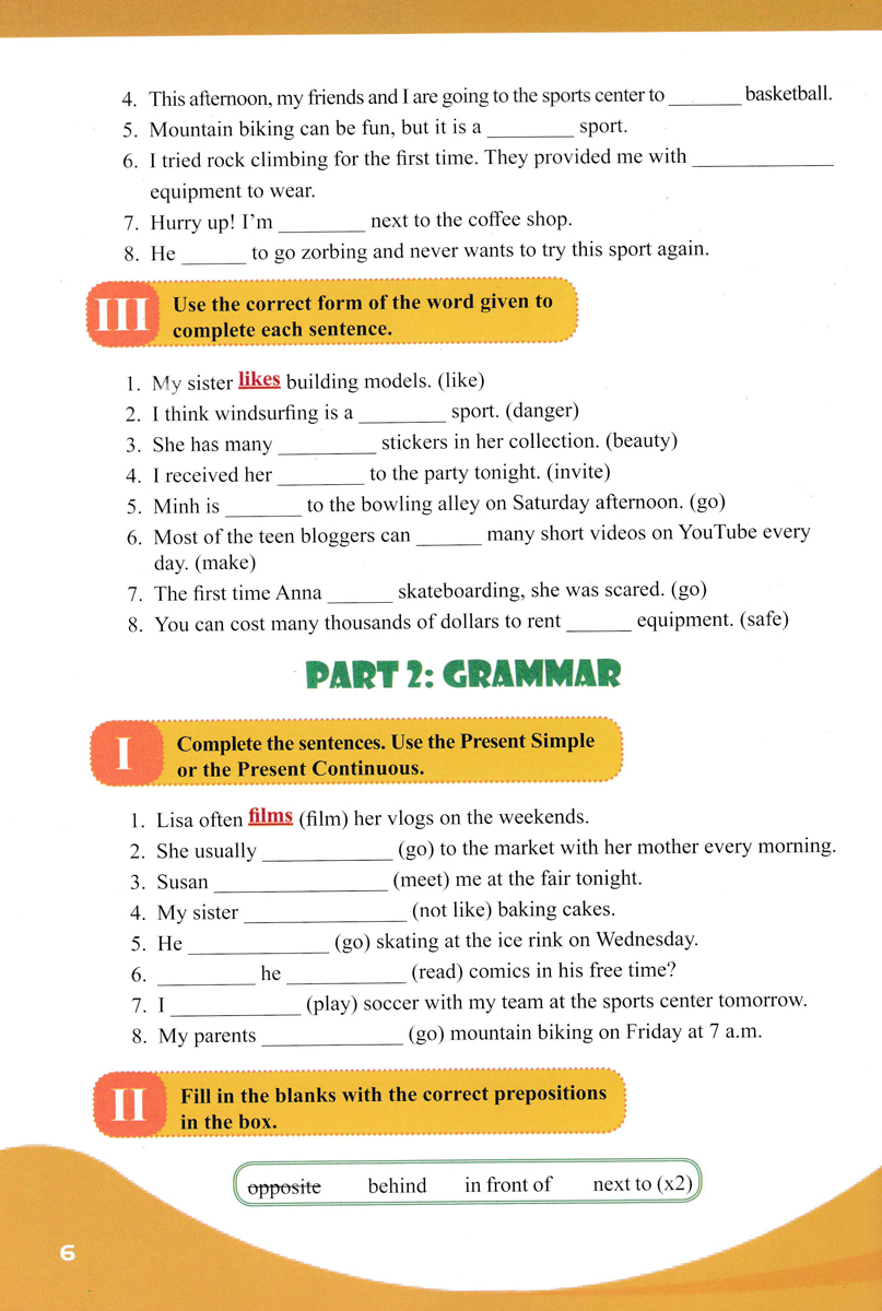 Phần 1: Unit Review and Tests (Các đề ôn tập và bài kiểm tra). Các đề ôn tập trong phần này sẽ được trình bày dưới dạng các bài luyện tập theo từng unit (Unit Review). Sau mỗi 2 hoặc 4 unit sẽ có một bài kiểm tra (Test) tương ứng với từng học kì để học sinh có thể tự kiểm tra .