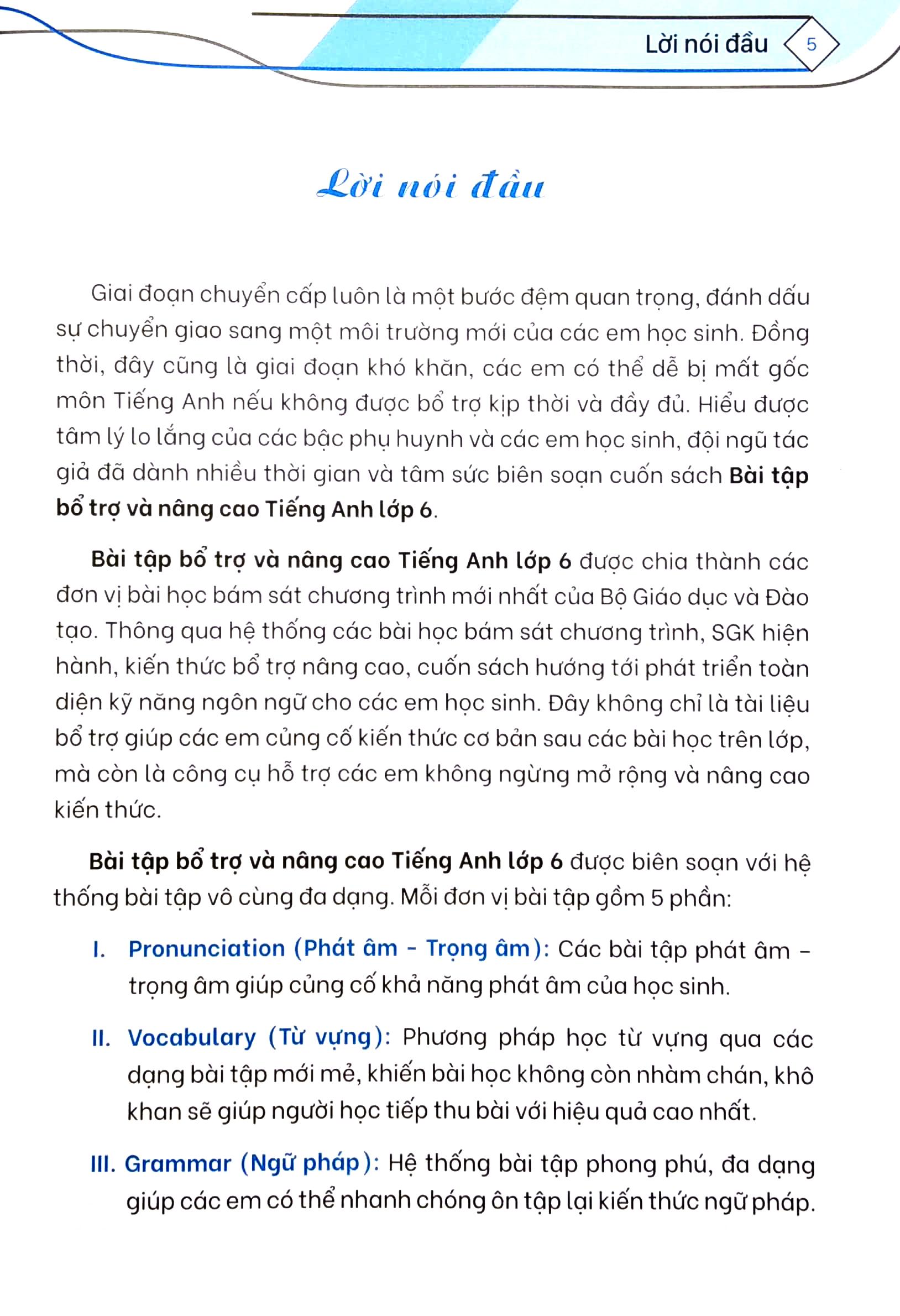 Bài Tập Bổ Trợ Và Nâng Cao Tiếng Anh Lớp 6 - Tập 1 (Có Đáp Án) Cuốn sách được chia thành các đơn vị bài học bám sát chương trình mới nhất của Bộ giáo dục và Đào tạo . Đây không chỉ là tfai liệu bổ trợ giúp các em củng cố kiến thức cơ bản sau các bài học trên lớp , mà còn là công cụ hỗ trợ các em không ngừng mở rộng và nâng cao kiến thức. át âm - trọng âm 2.Từ vựng ữ pháp 4.Kỹ năng đọc 5.Kỹ năng viết