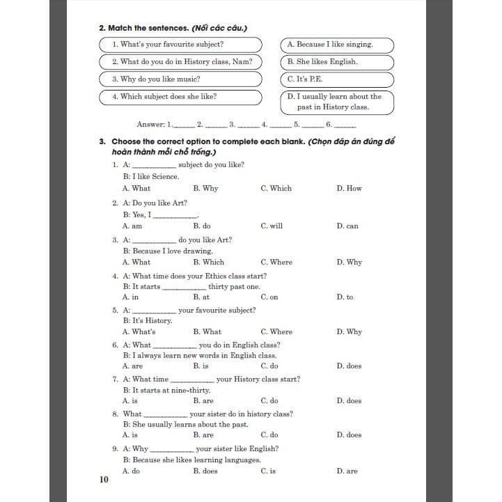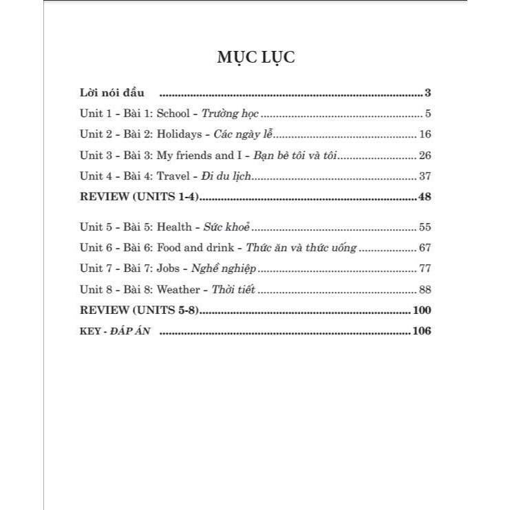 Lưu ý trước khi làm bài tập, các em nên xem qua phần từ vựng và ngữ pháp ở đầu mỗi bài. Phần này không những chú thích ý nghĩa của từng từ vựng mà còn giảng giải chi tiết cách dùng từng mẫu câu. Điều này sẽ giúp các em làm tốt tất cả các bài tập trong sách. Hy vọng cuốn sách này sẽ là một tài liệu hữu ích cho các em trong việc