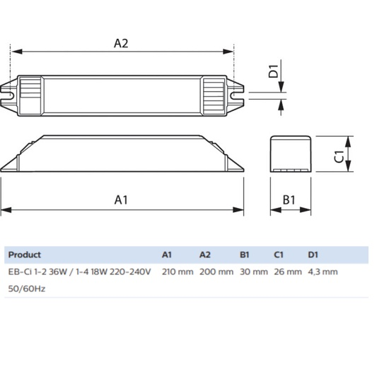 Một Ballast (Tăng phô/ chấn lưu) điện tử Philips EB-Ci 1-2 36W / 1-4 18W 220-240V 50/60Hz có thể dùng cho 1-2 bóng huỳnh quang công suất 36W hoặc 1-4 bóng huỳnh quang 18W.