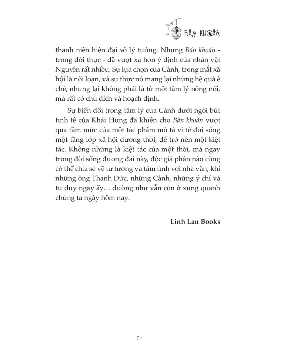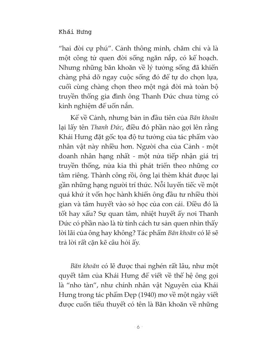 Băn Khoăn nằm trong giai đoạn đỉnh cao của sự nghiệp Khái Hưng - thường được biết tới như một tinh tú của văn học Việt Nam trước 1945. Băn khoăn đã vút lên và vượt tầm khỏi toàn bộ những quan niệm thông thường về một tác phẩm mổ xẻ hay phê phán thế hệ “nho tàn”, mà đầy khách quan, lạnh lùng, tinh tế dựng lại một chân dung sinh động của thanh niên đời xưa, cả tốt, cả xấu, cả đức hạnh và tuyệt tình, còn nguyên những nét tương đồng với đời sống hôm nay và ngay bây giờ.