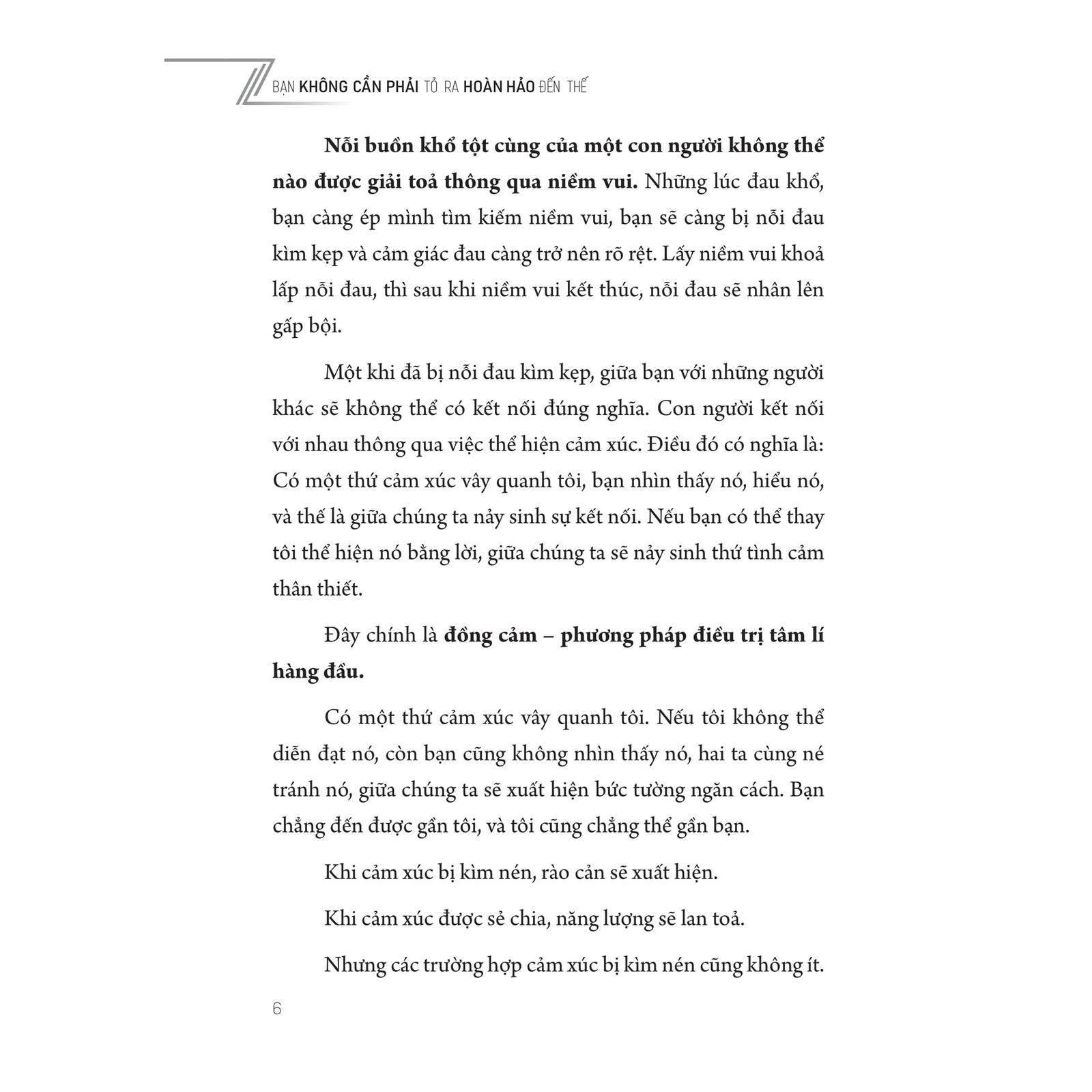 Cuốn sách Bạn Không Cần Phải Tỏ Ra Hoàn Hảo Đến Thế sẽ hỗ trợ bạn đồng cảm, thấu hiểu và chia sẻ cảm xúc của mình một cách tích cực và chân thành; cũng như giúp bạn học cách yêu thươngvà được yêu thương, mở lòng mình với đối phương thật chân thực;từ đó bạn sẽ sống một cuộc đời nhẹ nhàng và ý nghĩa hơn!