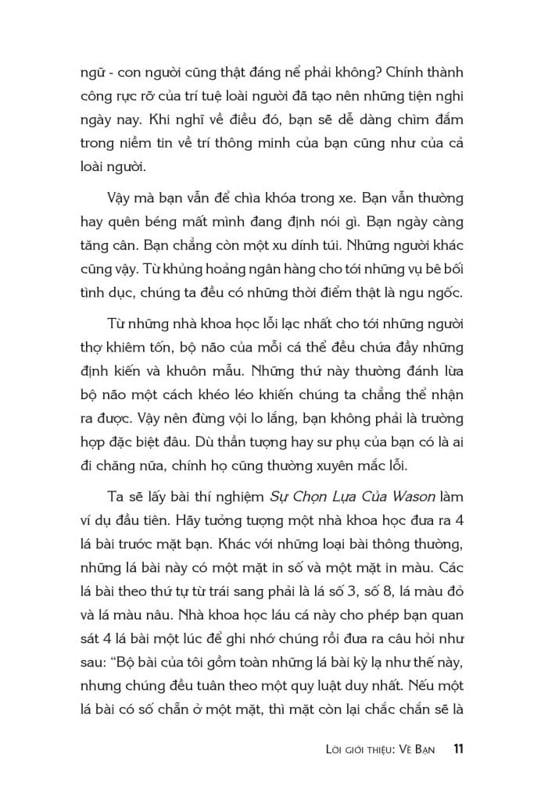 Cho dù bạn có đang chọn mua smartphone hay đang quyết định xem nên tin theo chính trị gia nào, thì bạn cũng luôn tự cho mình là một cá thể đầy lý trí. Tất cả mọi suy nghĩ, hành động của bạn đều dựa trên những luận điểm, luận cứ rõ ràng, logic và trung lập. Nhưng đây mới là thực tế này: Bạn – Không – Thông – Minh - Lắm - Đâu. Bạn cũng chỉ là một kẻ hay tự dối mình như tất cả những người khác - nhưng đừng lo, bởi ảo tưởng là một phần của bản chất của con người.