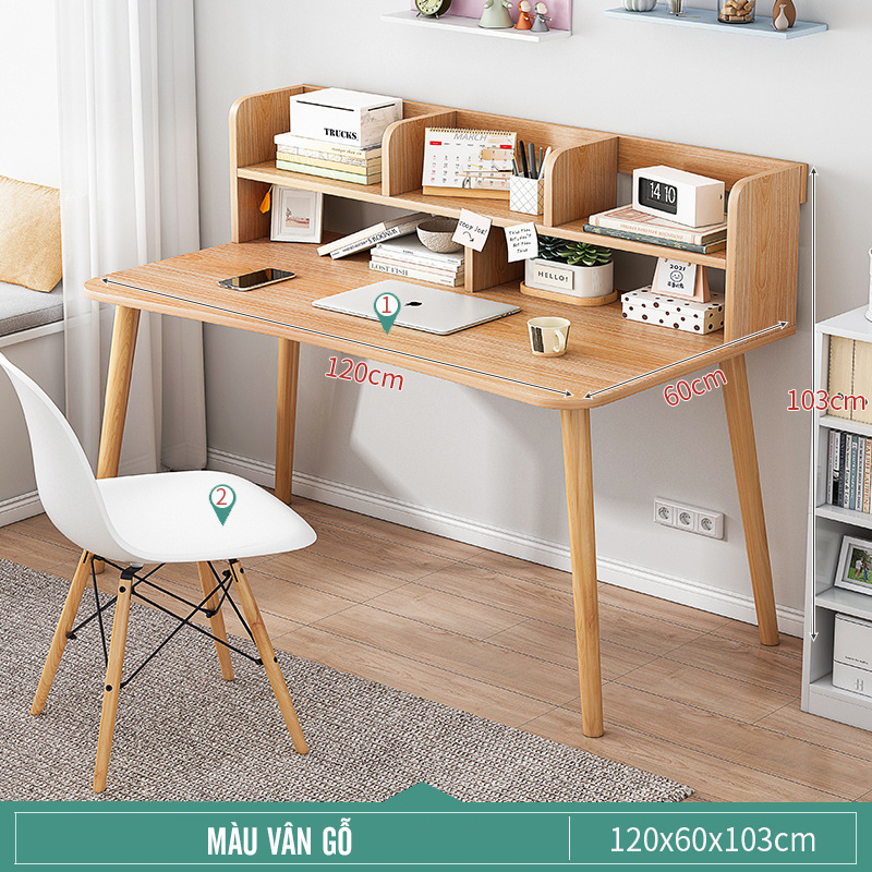 - Tên sản phẩm: Bàn làm việc kèm ngăn kéo và kệ để đồ - Chất liệu: Gỗ MDF phủ melamine cao cấp chống xước - chân bàn gỗ tự nhiên - Màu sắc: Vân gỗ sồi - Kích thước: 80/120 x 55 x 82cm (dài x rộng x cao) - Công năng: Là mẫu bàn làm việc, bàn học giúp tiết kiệm diện tích không gian phòng