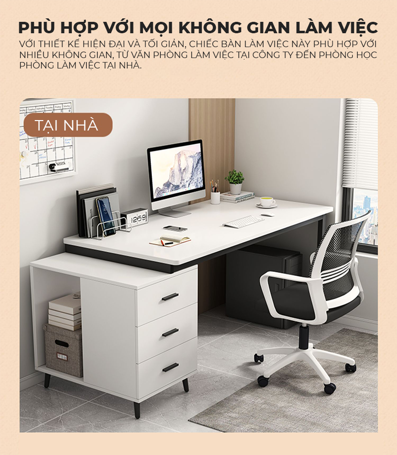 Công năng: Là mẫu bàn làm việc có thiết kế hiện đại kèm tủ hồ sơ đa năng phù hợp tại nhà và cả văn phòng làm việc