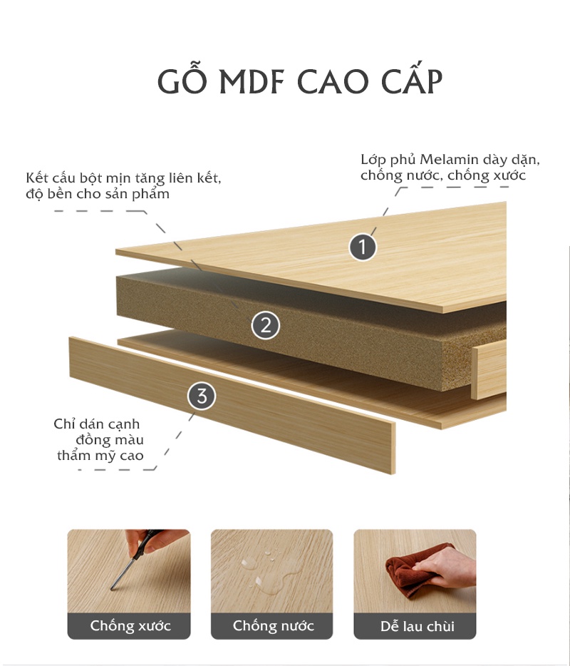 Chất liệu: Sản phẩm sản xuât từ gỗ MDF phủ melamin cao cấp chống xước chống nước bề mặt sáng bóng.