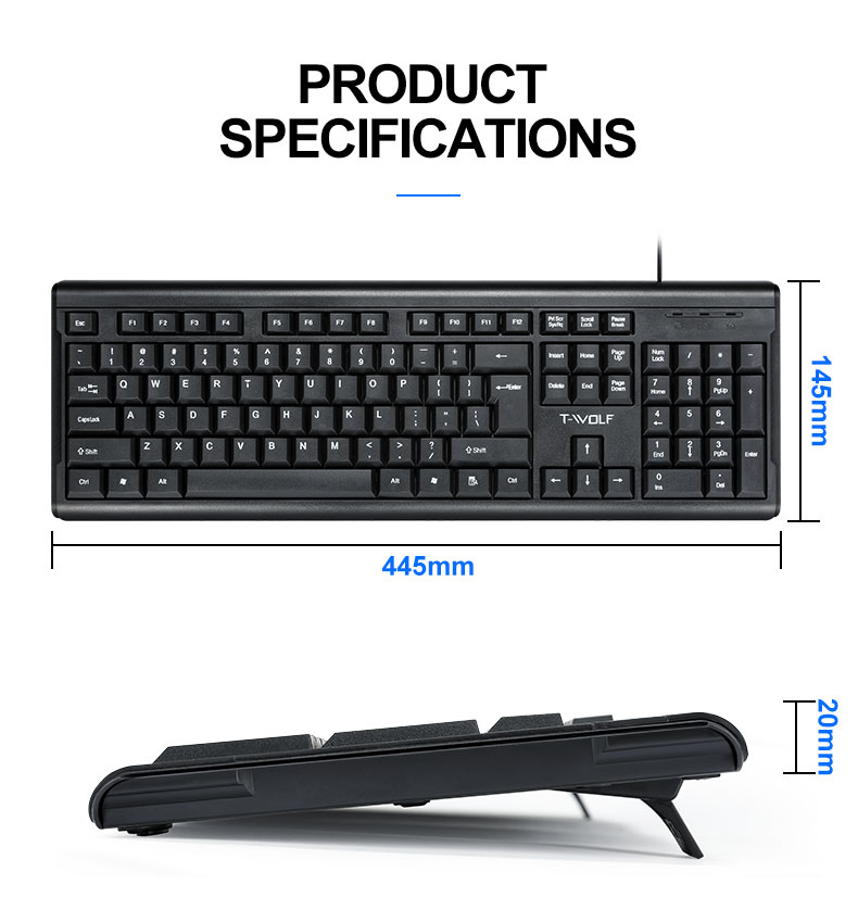 Bàn phím được làm từ chất liệu nhựa ABS cao cấp, chống va đập và trầy xước, đảm bảo độ bền bỉ theo thời gian. T-Wolf T15 là bàn phím cơ full-size dành cho văn phòng và chơi game với thiết kế mỏng nhẹ, thời trang, mang đến trải nghiệm gõ phím êm ái, chính xác và độ bền cao. T-Wolf T15 sở hữu thiết kế mỏng nhẹ, chỉ 20mm, giúp tiết kiệm không gian bàn làm việc và dễ dàng mang theo khi di chuyể