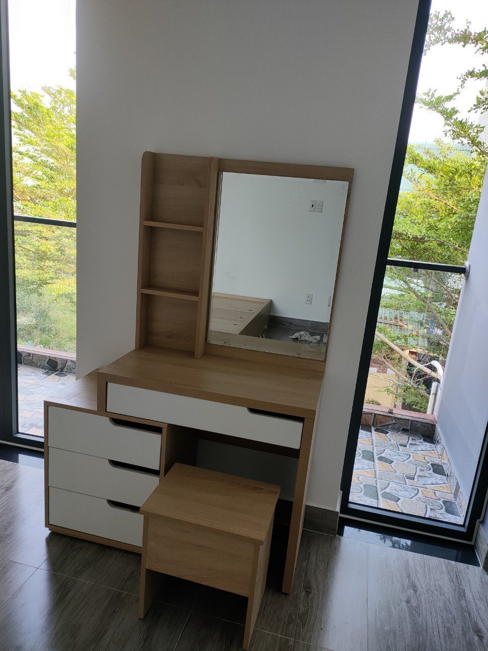 Mua tại TiktokTên sản phẩm: BÀN TRANG ĐIỂM 001 Mã sản phẩm: BTĐ001 Kích thước: dài 1000 x sâu 500 x cao 1500mm Mô tả: 3 hộc kéo, 1 hộc trống tiện dụng Vật liệu: ván MDF phủ Meamine nhập khẩu Thái Lan Phụ kiện lắp ráp: ray bi 3 tầng, bản lề hơi, bát sắt, ốc liên kết hàng cao cấp