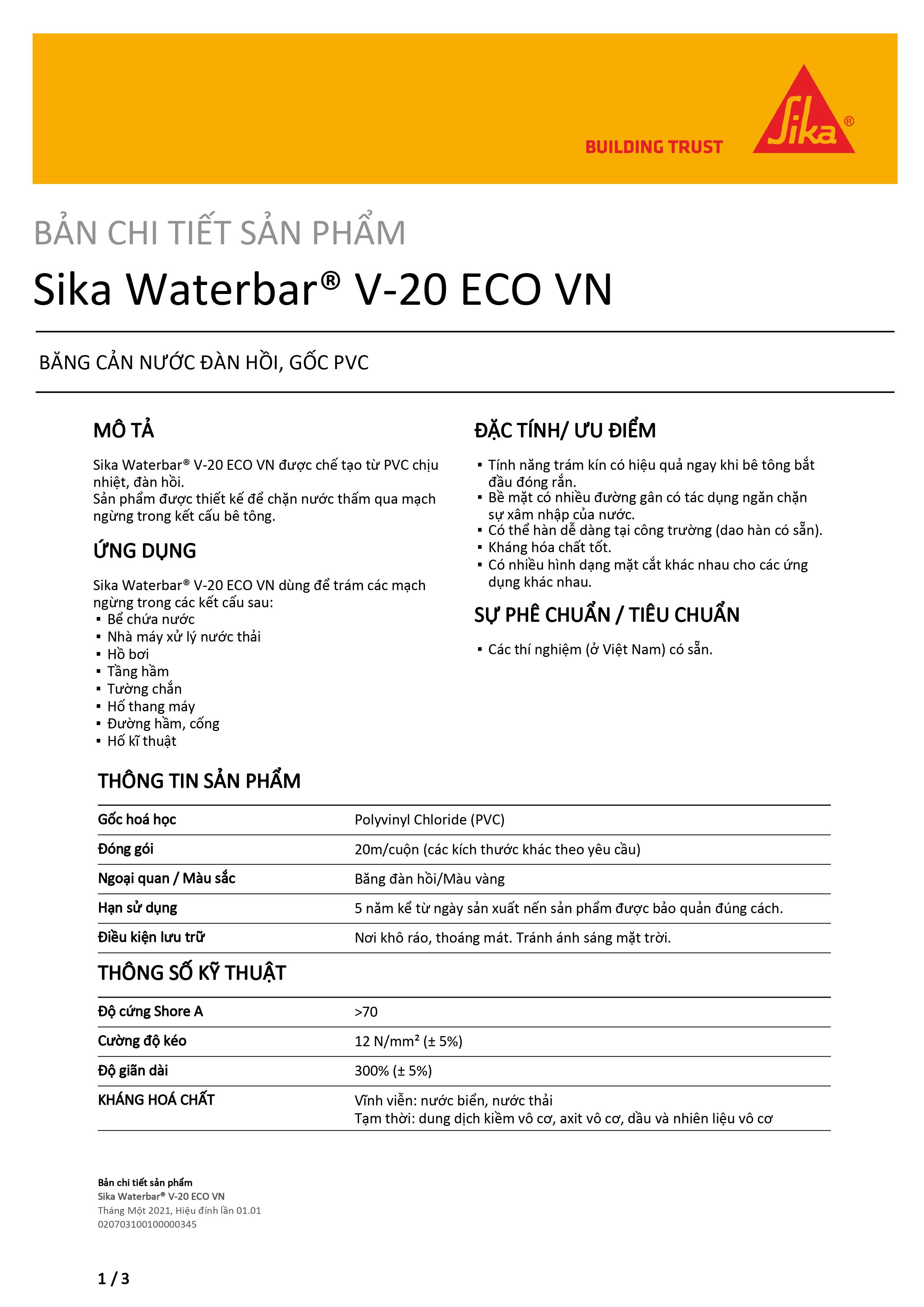 Mô tả: Sika Waterbar V-20 ECO VN được chế tạo từ PVC chịu nhiệt, đàn hồi.
