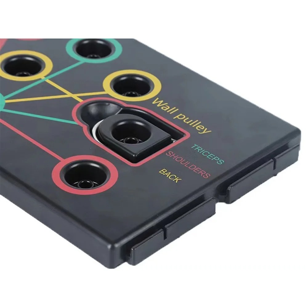 - Dụng cụ chống đẩy mã hóa màu khác nhau nhắm mục đích luyện tập thể dục cơ bắp cụ thể (đỏ cho vai, vàng cho lưng, xanh cho cơ tam đầu).