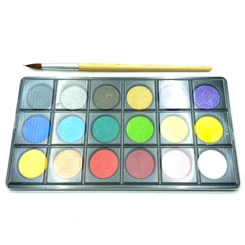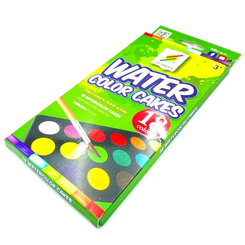Hộp 18 Bánh Màu Nước được đựng trong khay nhựa giúp dễ dàng nhận biết màu và pha trộn các màu với nhau.