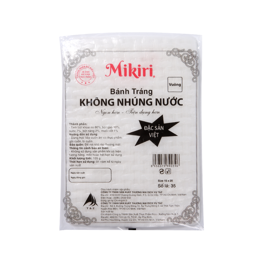 Bánh tráng Vuông không nhúng nước Mikiri với các nguyên liệu được chọn lọc kĩ lưỡng. Dùng làm bì cuốn, gỏi cuốn hay cuốn chả giò đều được. Khi sử dụng bạn hoàn toàn không