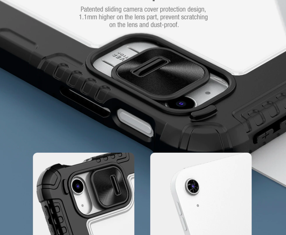 Bao da chống sốc cho iPad Gen 10 hiệu Nillkin Bumber Pro có ngăn đựng bút có trang bị 1 nắp đậy dày 1.1mm giúp bảo vệ camera của chiếc iPad Gen 10 tránh bị trầy xước va chạm và chống bụi bẩn.