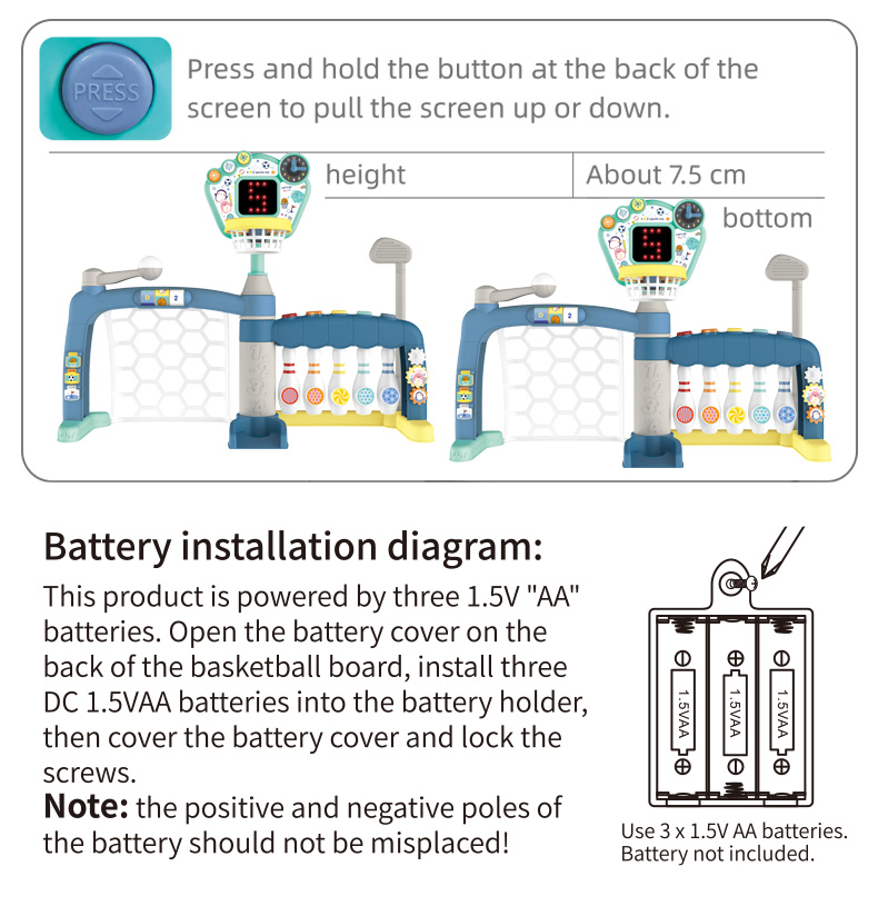 Bộ đồ chơi mô phỏng vận động siêu vui tích hợp 3 môn: bóng đá, bóng rổ và golf mini, giúp bé: Rèn thể lực và kỹ năng phối hợp nhóm. Phát triển phản xạ