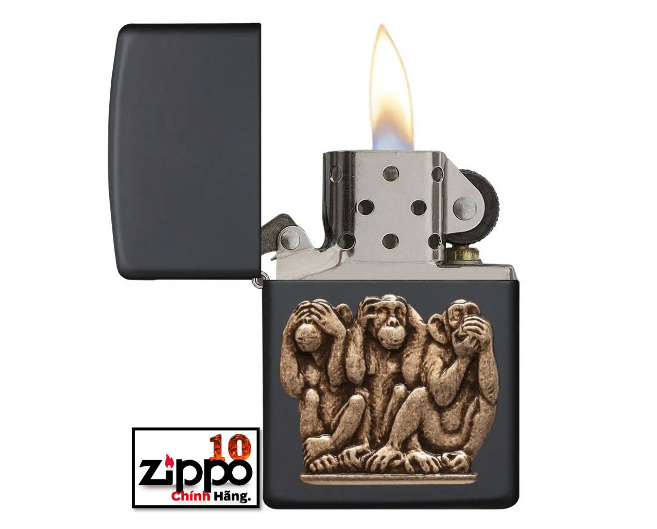 Thấy không có ác. Không nghe thấy điều ác. Nói không ngoa. Một cách thực hiện mới của lời khuyên lâu đời từ các loài linh trưởng ba chiều đã được đúc bằng đồng thau nguyên khối và đặt trên một chiếc bật lửa đen mờ cổ điển. Được đóng gói trong một hộp đựng dạng quà tặng. Để tối ưu hiệu suất, hãy dùng nhiên liệu bật lửa của Zippo.