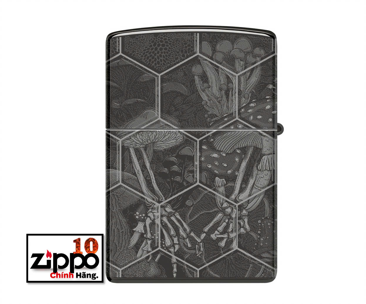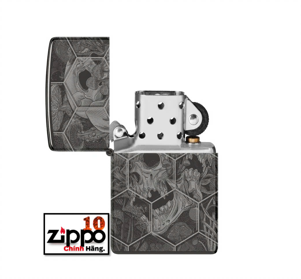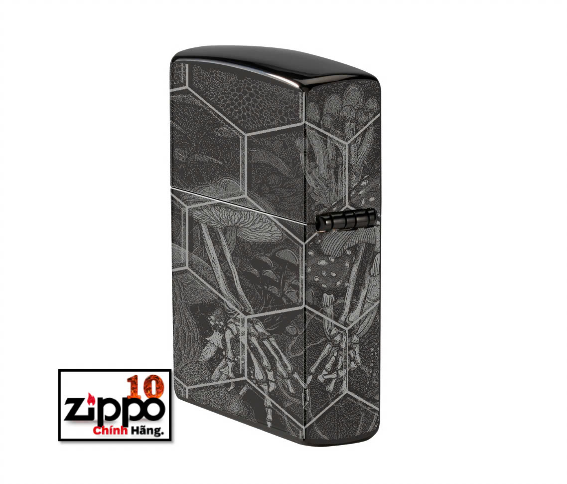 Được đóng khung theo họa tiết tổ ong phức tạp, nấm mọc ra từ những hộp sọ đang phân hủy trên mọi bề mặt của chiếc bật lửa High Polish Black cổ điển này với