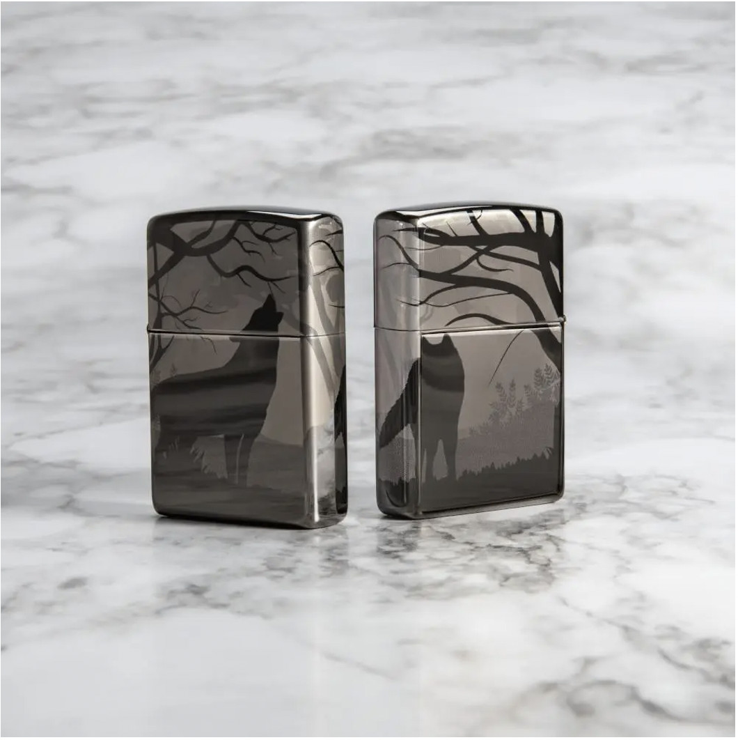 Cho dù bạn là một con sói đơn độc hay một thành viên của một bầy sói thì chiếc bật lửa Wolves mới này chắc chắn sẽ làm thỏa mãn niềm đam mê đó của bạn.Trong khung cảnh tuyệt đẹp này, bạn sẽ tìm thấy hình bóng của một con sói đang hú trong màn đêm ở sâu bên trong một khu rừng tối tăm. Hãy xoay chiếc bật lửa lại, bạn sẽ thấy một con sói khác đang đứng bảo vệ ở phía sau. Hình ảnh này liền mạch xuyên suốt toàn bộ bề mặt của bật lửa Black Ice bằng quy trình Photo Image 360° của Zippo. Được đóng gói trong một hộp đựng dạng quà tặng. Để tối ưu hiệu suất, hãy dùng nhiên liệu bật lửa của Zippo.