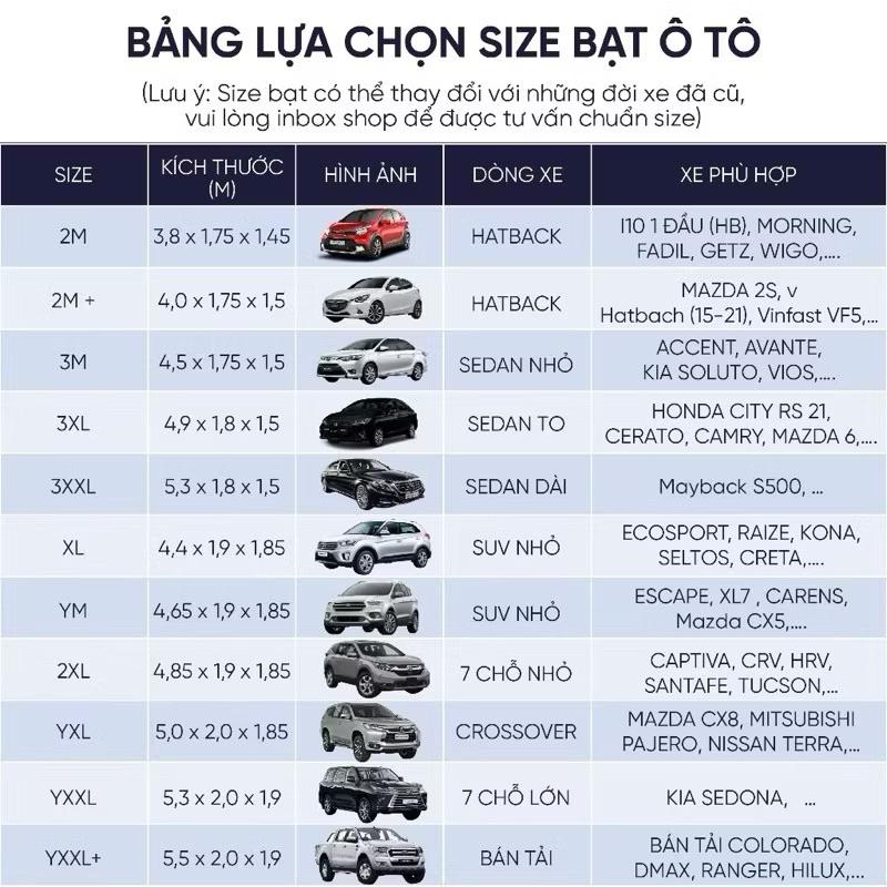 - Size 3M (4,5 x 1,75 x 1,5): AVEO, GENTRA, LACETI EX , CX3,FIESTA SD, FORCUS HB, SD, LASER, CITY,ACCENT, AVANTE, ELANTRA (10-14),CERATO/FORTE (09-13), RIO SD,SOLUTO, SPECTRA, MAZDA 2 SD (15-21),MAZDA 323, MAZDA 3 (03-09), .... 3XL (4,9 x 1,8 x 1,5) 4 chỗ :CITY RS (21-23) , BMW 320i, NUBIRA, MONDEO, ACCORD, CIVIC ( 17-23) ELANTRA (15-21), CERATO (13-21), MERC C (10-21), MERC E 2010 , MAZDA 3 SD, HB (15-21), MAZDA 6 TEANA, ALTIS (14-21), CAMRY, LUX A, SONATA, OPTIMA MAZDA CX30, LEXUS IS 250, AVALON, CRUZE, LACETI CDX K3 , FORCUS SD, mg5
