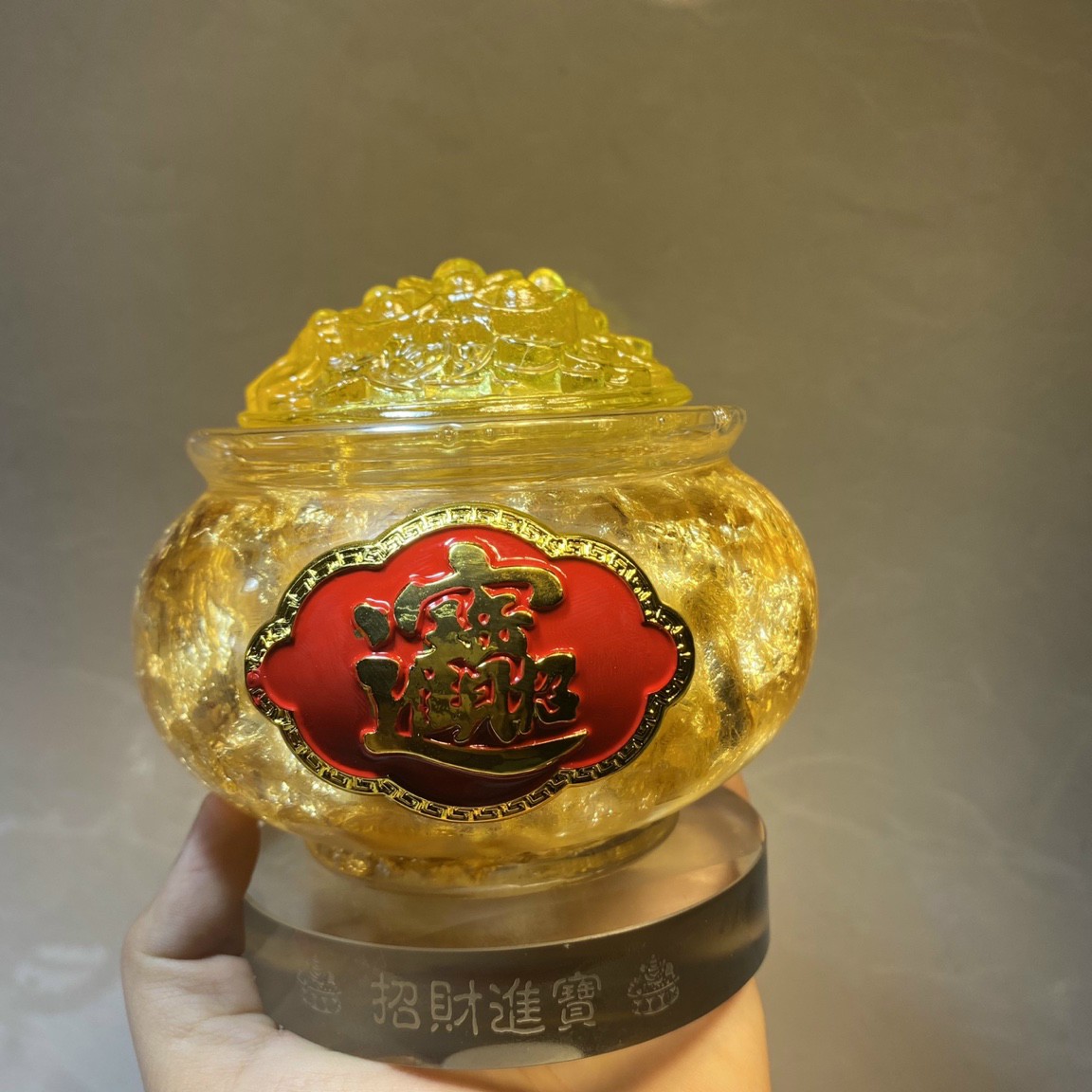 Mua tại TiktokBát Tụ Bảo vàng lá Thần Tài đế thủy tinh 12cm phong thủy - sung túc chiêu Tài đón Lộc