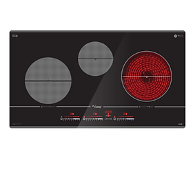 Mua tại Tiktok• Bếp ba: 2 vùng từ + 1 vùng hồng ngoại, sử dụng mặt kính Schott Ceran vát 2 cạnh bo góc Sử dụng mâm từ, mâm nhiệt E.G.O Germany tiêu chuẩn đạt chất lượng EMC, CE