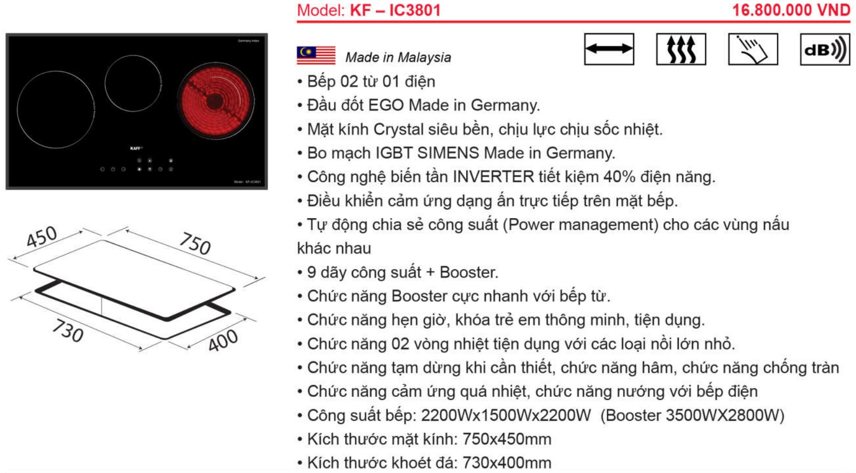 • Bếp 03 từ • Mặt kính Schott Ceran Made in Germany • Bo mạch EGO Made in Germany • Công nghệ biến tần INVERTER tiết kiệm 40% điện năng • Chức năng Booster nấu
