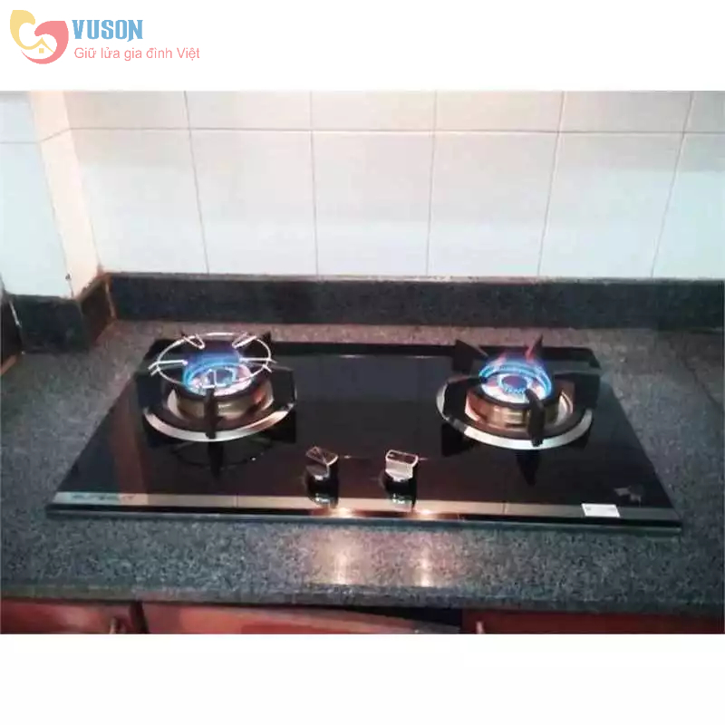 Bếp 02 lò: 01 lò to, 01 lò nhỏ Mâm chia lửa bằng đồng Hệ thống đánh lửa pin Pép hầm tiết kiệm gas Mặt kính cường lực, màu đen Kiềng gang đúc Lượng gas