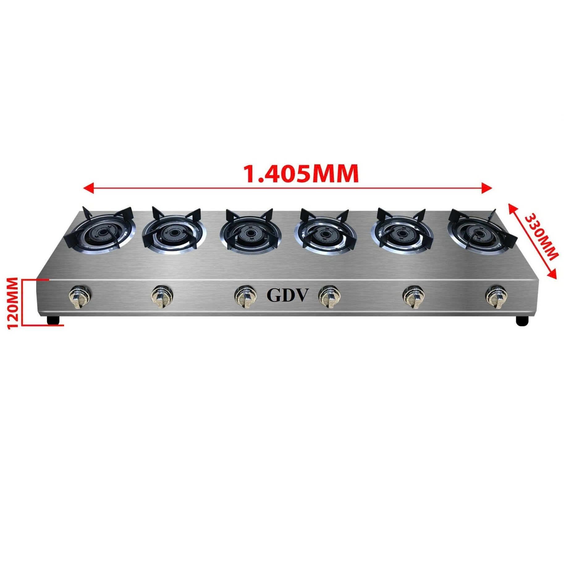 Bếp Gas Khè Bán Công Nghiệp Inox GDV 6 Lò Đốt Chuyên Mỳ Cay, Bánh Xèo - Hàng Chính Hãng có 6 lò đun, điều khiển lửa to nhỏ bằng núm vặn tiện lợi.