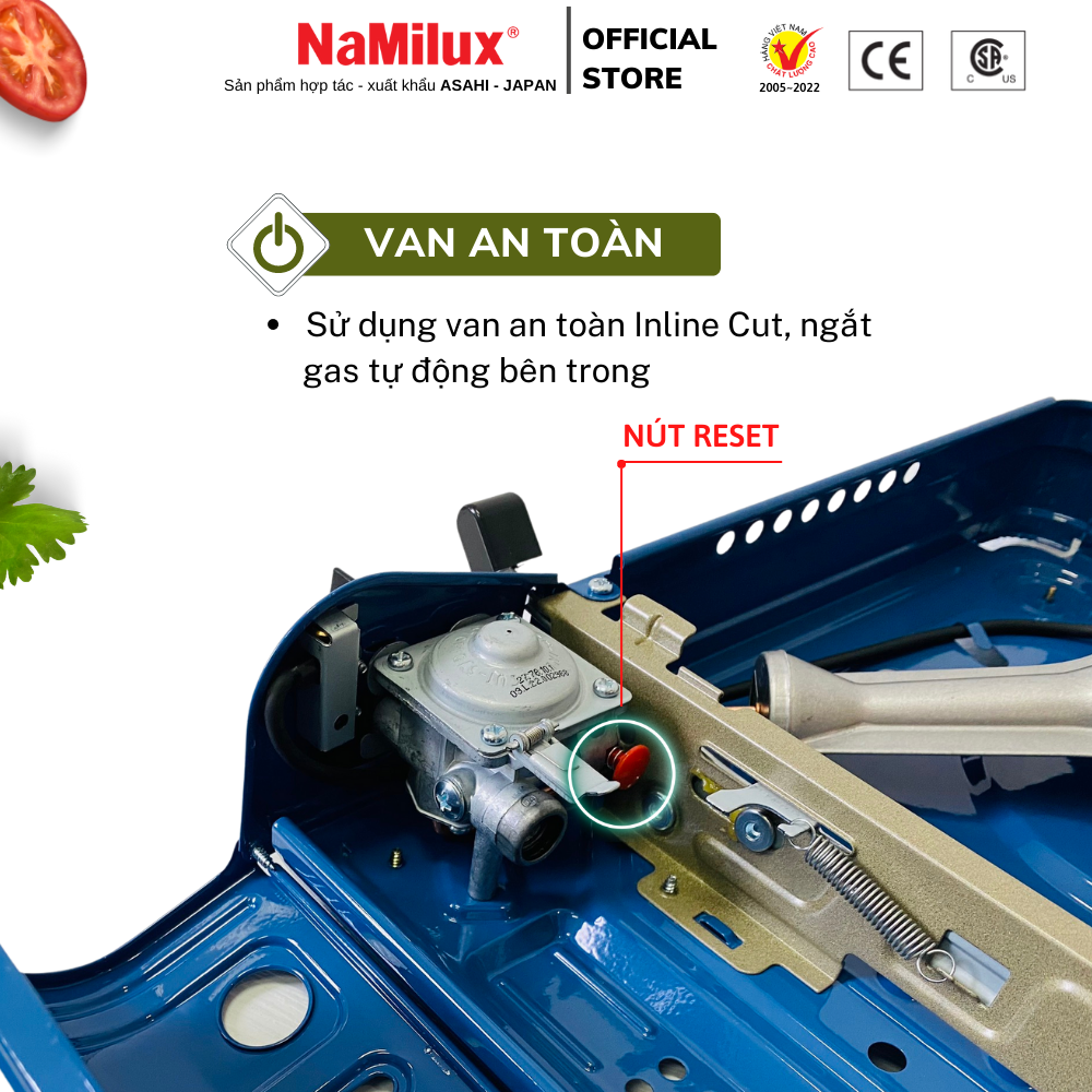 Bếp gas mini NaMilux được trang bị hệ thống van Inline Cut - ngắt gas tự động, được sản xuất trên dây chuyền đạt chuẩn Quốc Tế & độ an toàn cao: khi sử dụng lon gas có áp quá cao (thường là lon gas sạc lại), bộ phận ngắt gas sẽ tự động ngắt gas và tắt lửa, đảm bảo an toàn tuyệt đối trong suốt quá trình sử dụng bếp.