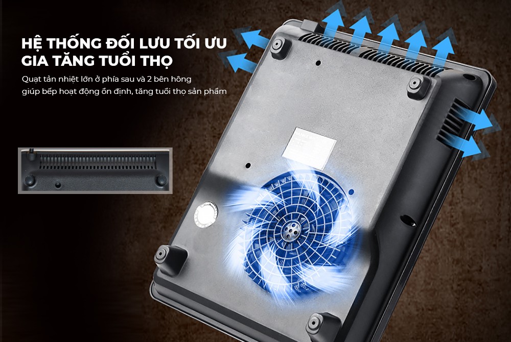 Dù không trực tiếp dùng nhiệt để đun nấu nhưng sản phẩm vẫn trang bị quạt tản nhiệt lớn ở phía sau và 2 quạt bên hông để đảm bảo các linh kiện bên trong luôn được mát, giữ cho mâm từ có nhiệt độ ổn định trong suốt quá trình hoạt động.