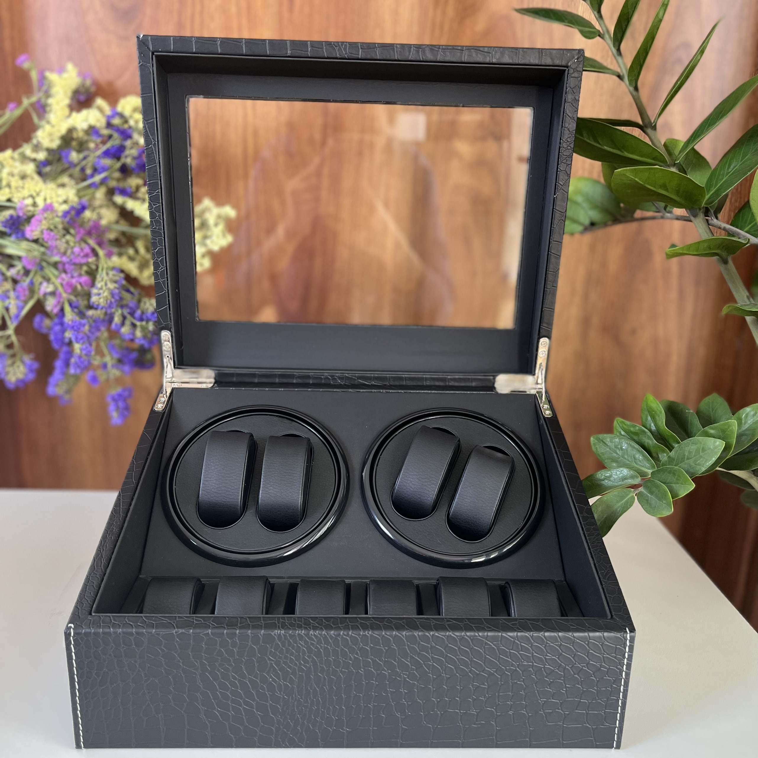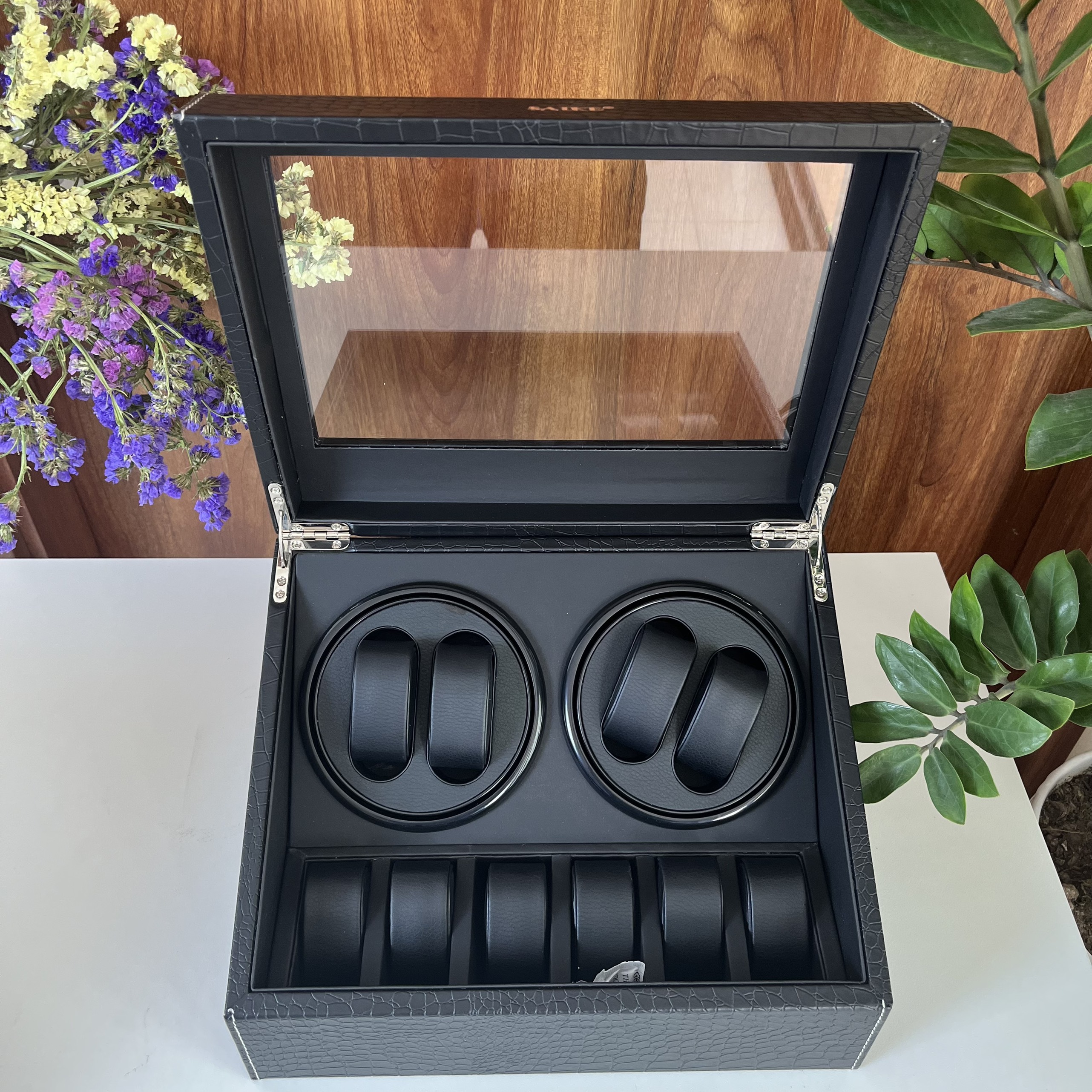 Thông tin sản phẩm: Hộp Xoay Đồng Hồ Cơ SAIKE S4602 Mẫu 4 Xoay 6 Tĩnh Vỏ Da Cá Sấu Màu Đen - Thương hiệu: SAIKE - Hộp thiết kế đựng 4 chiếc đồng hồ