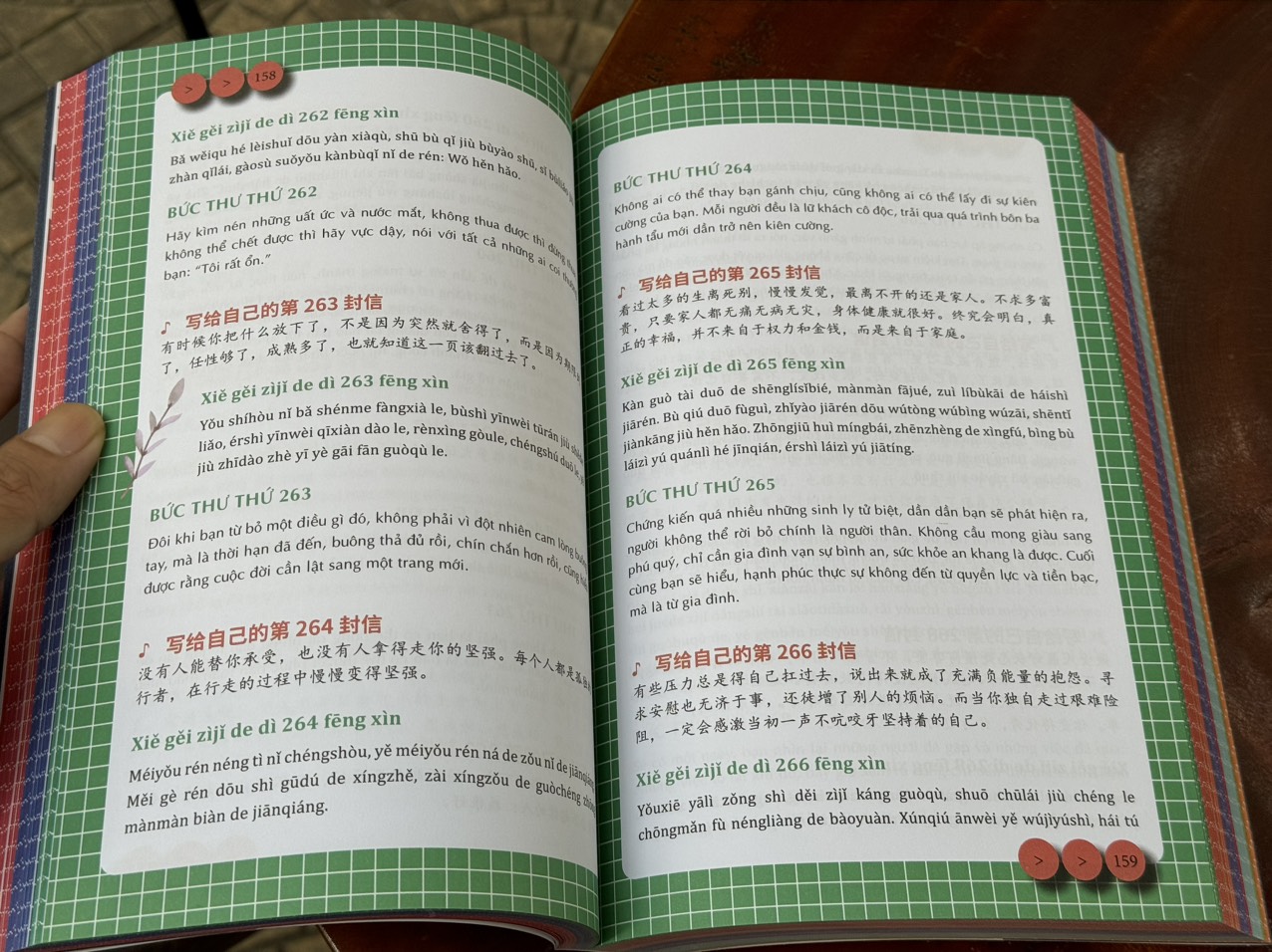 Giờ đây, nhằm đáp ứng nhu cầu của những độc giả có niềm yêu thích ngôn ngữ Trung Quốc, Vanvietbooks hân hạnh ra mắt “999 lá thư gửi cho chính mình” – Phiên bản Song ngữ toàn tập với đầy đủ 999 lá thư chỉ trong 1 cuốn sách duy nhất! Được lấy cảm hứng từ chiếc tủ sách – tượng trưng cho nguồn kiến thức dồi dào, mới lạ đang chờ đón bạn khai phá - từng trang sách chính là từng ô tủ chứa đựng những lá thư thân quen không chỉ mang tính truyền cảm hứng sống mà còn “đính kèm” cả Hán tự và phiên âm được trình bày khoa học, hợp lý và đẹp mắt, là một công cụ rất tốt để giúp bạn đọc rèn luyện và nâng cao khả năng ngoại ngữ, trau dồi kiến thức, đúng với tiêu chí giúp bạn trở thành phiên bản hoàn hảo nhất của chính mình.