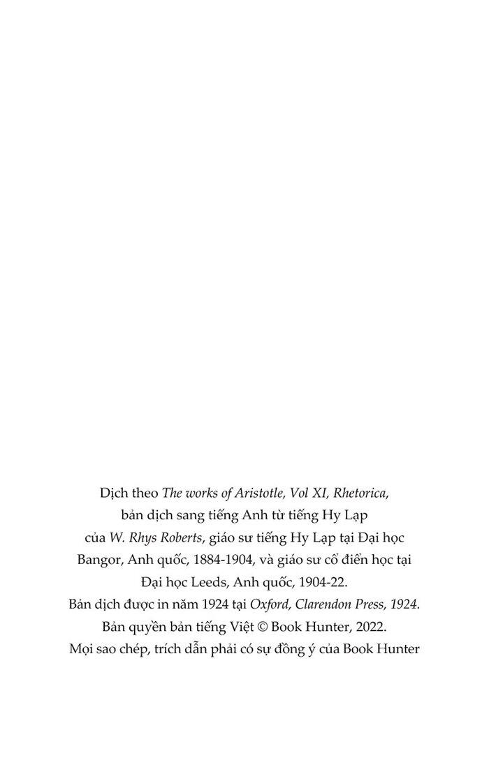 Biện Luận - Rhētorikḗ - Tác Phẩm Triết Học Kinh Điển Trước nay, chúng ta thường nhầm lẫn giữa “biện luận”, “hùng biện” và “diễn thuyết”… từ đó dẫn đến sự phân tích và đánh giá sai tính khả tín của các diễn ngôn và văn bản. Mặc dù “Biện Luận” của Aristotle là một tác phẩm quan trọng trong phương pháp tư duy và biểu đạt, nhưng sự nhầm lẫn giữa “biện luận” và “hùng biện” hay “diễn thuyết” đã khiến tác phẩm bị hiểu theo chiều hướng thuyết phục niềm tin của người nghe. Trên thực tế “Biện Luận” của Aristotle là một công cụ tư duy để truy vấn các luận điểm và biểu đạt thực tại thông qua ngôn ngữ. “Biện Luận” cần thiết cho bất cứ ai hoạt động trong ngành khoa học thông tin, báo chí, truyền thông, nghiên cứu, pháp luật. Và mỗi sinh viên, dù ở ngành học hay cấp bậc nào, cũng cần biết cách “Biện Luận” để thực hiện các tiểu luận, luận văn, luận án nghiên cứu có giá trị. Cuốn sách đặc biệt hữu ích trang bị công cụ tư duy cho những ai không muốn bị thao túng tâm lý bởi các thuật ngụy biện thường thấy. Cái đúng và cái gần đúng được nhận dạng theo cùng một cách, có thể hiểu là mọi người đều có một đặc tính bẩm sinh đầy đủ để hiểu đâu là đúng, và thường hướng đến chân lý. Bởi vậy hễ ai phán đoán đúng về sự thật thì cũng có thể phán đoán đúng về tính không chắc chắn. Quyển I, chương 1 Biện luận hiệu quả bởi vạn sự đều đúng và chúng luôn có một chiều hướng tự nhiên để thắng thế trước cái đối lập của m.ình, cho nên nếu phán quyết của các thẩm phán không hợp lẽ thì việc thành bại lại nằm trong tay các nhà diễn thuyết và theo đó họ phải bị định tội. Hơn nữa, trước khi khán giả nào đó thậm chí còn chưa bị ám ảnh với tri kiến chính xác nhất thì cũng sẽ tùy tiện với những gì chúng ta nói để đưa ra lời buộc tội. Với các luận điểm dựa trên tri kiến ẩn chứa sự chỉ dẫn, vẫn có những người mà không ai có thể chỉ dẫn. Do đó, tại đây, chúng ta phải dùng các ý niệm mà ai cũng hiểu như thể đó là lối biện thuyết và lập luận của m.ình khi trình bày các Chủ đề trong thương thảo để luận giải trước công chúng. Quyển I, chương 1 Như ta thấy, mỗi phần chính trong một bài diễn thuyết phải có mục đích rõ ràng. Xét mỗi trường hợp, chúng ta đã ghi chú và chấp nhận những quan điểm và đề xuất mà dựa vào đó ta có thể hình thành lên lập luận của m.ình - với chính trị, với tưởng thưởng, với cả diễn thuyết pháp lý. Chúng ta hơn nữa đã quyết định những phương tiện nào của tính cách đạo đức cần có để đầu tư vào bài nói. Bây giờ chúng ta tiến hành thảo luận các luận điểm chung cho tất cả các bài diễn thuyết. Tất cả các nhà diễn thuyết, bên cạnh khả năng lập luận chuyên biệt, thì cũng rất tiết chế khi sử dụng đề tài Khả thi và Bất khả, ví dụ; và cố gắng chỉ ra rằng một điều có thể xảy ra, hoặc sẽ xảy ra trong tương lai. Quyển II, chương 18