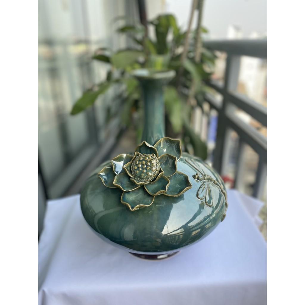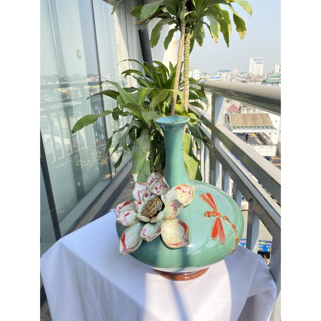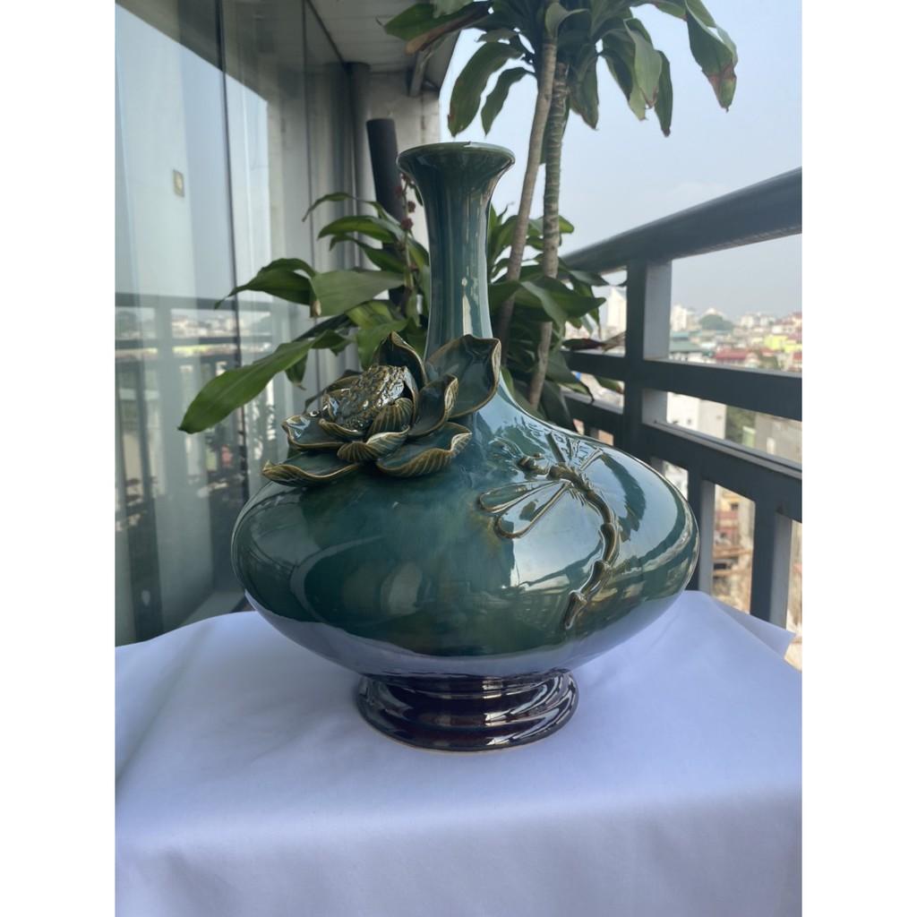 Mua tại TiktokBình hút tài lộc sứ Bát Tràng cao cấp, dáng cổ cao, bụng dẹt, men xanh hỏa biến với nước men căng bóng, sáng mịn cùng với họa tiết hoa sen đắp nổi cầu kỳ, được thực hiện thủ công 100% bởi bàn tay của các nghệ nhân lành nghề. Sản phẩm được trưng bày tại phòng khách, phòng làm việc, văn phòng, cửa hà vừa có tác dụng thu hút tài lộc đến cho chủ nhân vừa có tác dụng trưng các loại hoa theo mùa, giúp trang trí không gian trở nên ấn tượng, thu hút, mới mẻ, hấp dẫn. Bình hút tài lộc cao 35cm, miệng bình 6cm, vòng bụng bình 87cm
