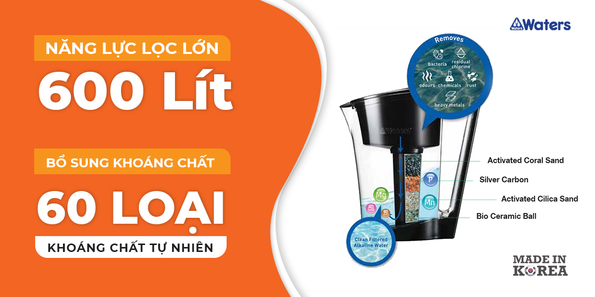 Đặc biệt, 4 cấp lọc giúp tạo ra hơn 60 loại các ion khoáng có hiệu quả đối với cơ thể con người, bao gồm Canxi và Magiê. WaterJug cũng giúp nước sau khi lọc sạch trở nên tươi mát tạo cảm giác ngon ngọt hơn nhiều.