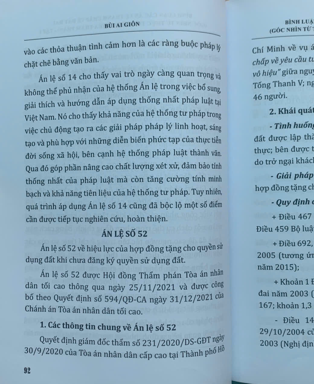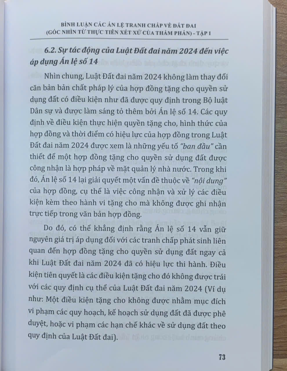 Hệ thống pháp luật về đất đai và giải quyết các tranh chấp về hợp đồng tại Việt Nam đã và đang trong quá trình liên tục hoàn thiện, với những thay đổi đáng kể được ghi nhận qua các thời kỳ. Sự phát triển này đặt ra yêu cầu cấp thiết về việc nghiên cứu, làm sáng tỏ các quy định pháp luật, đặc biệt là những điểm còn tồn tại với những cách hiểu khác nhau hoặc những khoảng trống pháp lý mà luật thành văn chưa kịp điều chỉnh. Trong bối cảnh đó, các án lệ càng khẳng định vai trò ngày càng quan trọng như một công cụ hữu hiệu để giải thích, bổ sung pháp luật, đảm bảo việc áp dụng pháp luật một cách thống nhất và công bằng trong thực tiễn xét xử. Do đó, việc nghiên cứu các án lệ đã trở thành một nhu cầu thiết thực của những người làm công tác pháp luật như Thẩm phán.