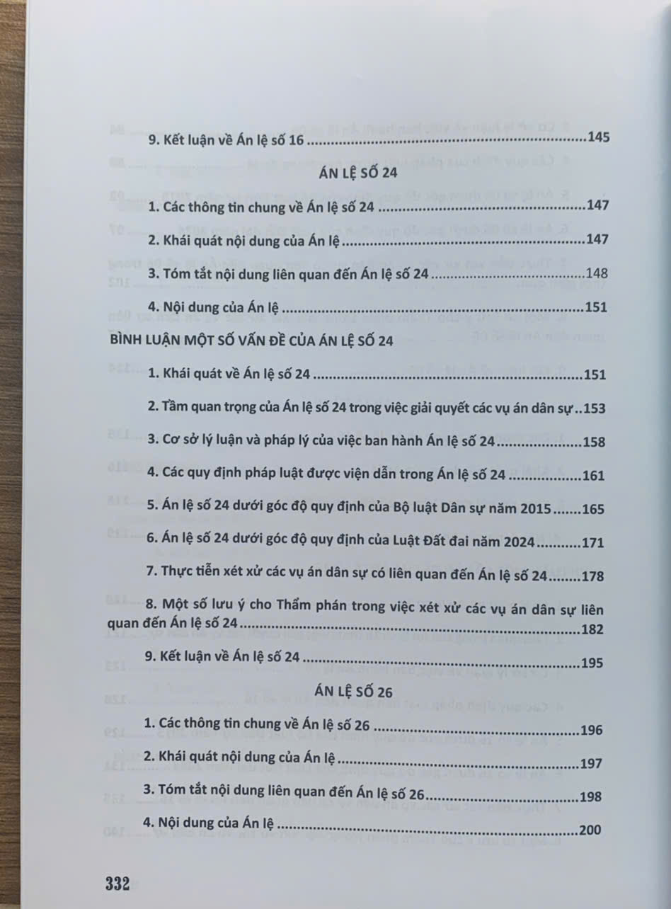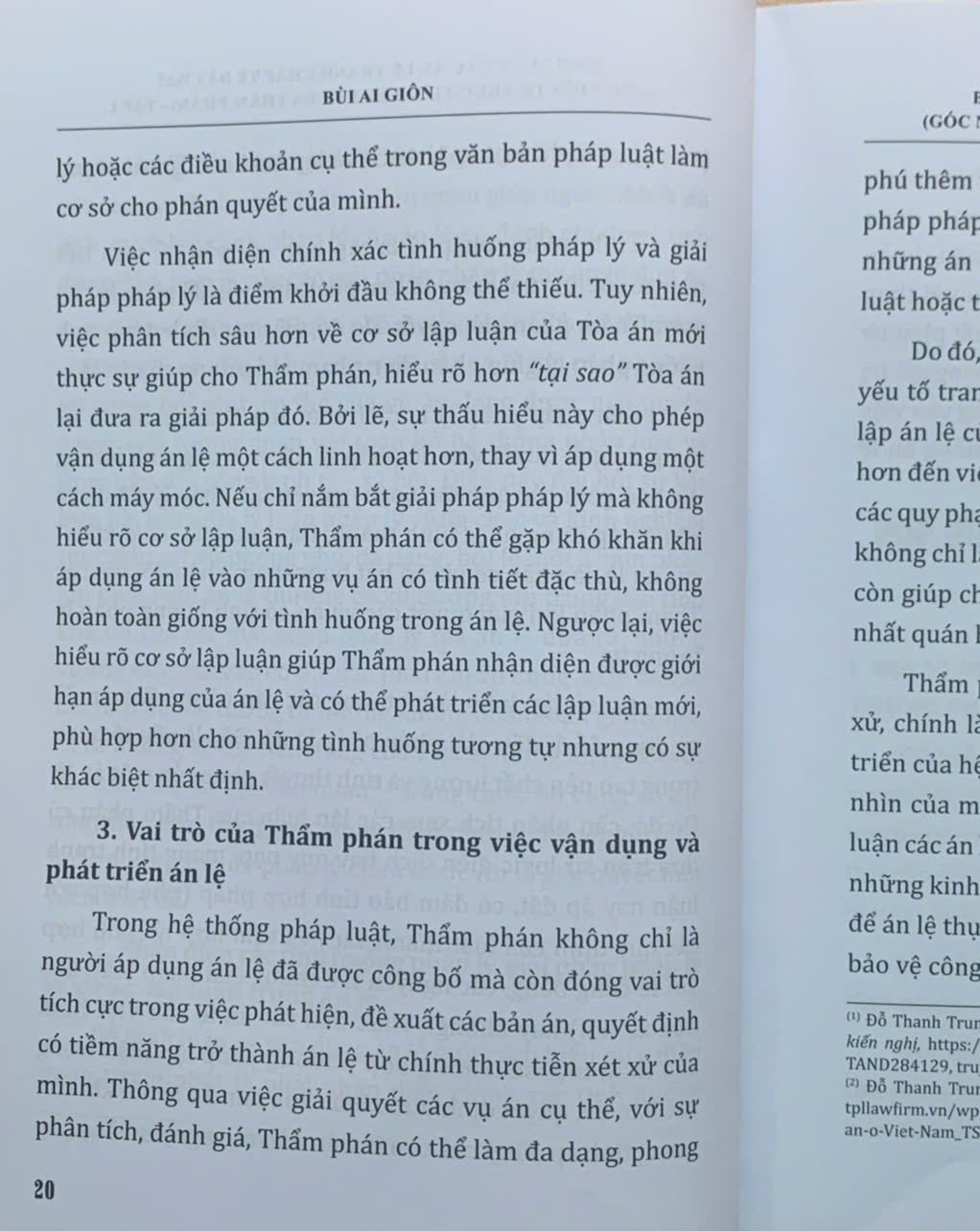 Với cuốn sách này, tác giả mong muốn chia sẻ những kinh nghiệm, những suy tư pháp lý được đúc kết qua nhiều năm nghiên cứu khoa học pháp lý và thực tiễn xét xử. Mỗi án lệ được bình luận không chỉ dừng lại ở việc tóm tắt nội dung hay trích dẫn quyết định của Tòa án, mà thay vào đó, tác giả sẽ phân tích sâu sắc bối cảnh, tình tiết cốt lõi của vụ án; bóc tách từng vấn đề pháp lý, làm sáng tỏ những vấn đề còn vướng mắc, những điểm mấu chốt dẫn đến quyết định của Hội đồng xét xử; đưa ra góc nhìn của Thẩm phán: Những lập luận, cân nhắc, những cơ sở để vận dụng pháp luật và án lệ trong quá trình giải quyết; mở rộng và liên hệ với các quy định pháp luật có liên quan, chỉ ra những điểm tương đồng, khác biệt và những bài học kinh nghiệm quý báu có thể rút ra.