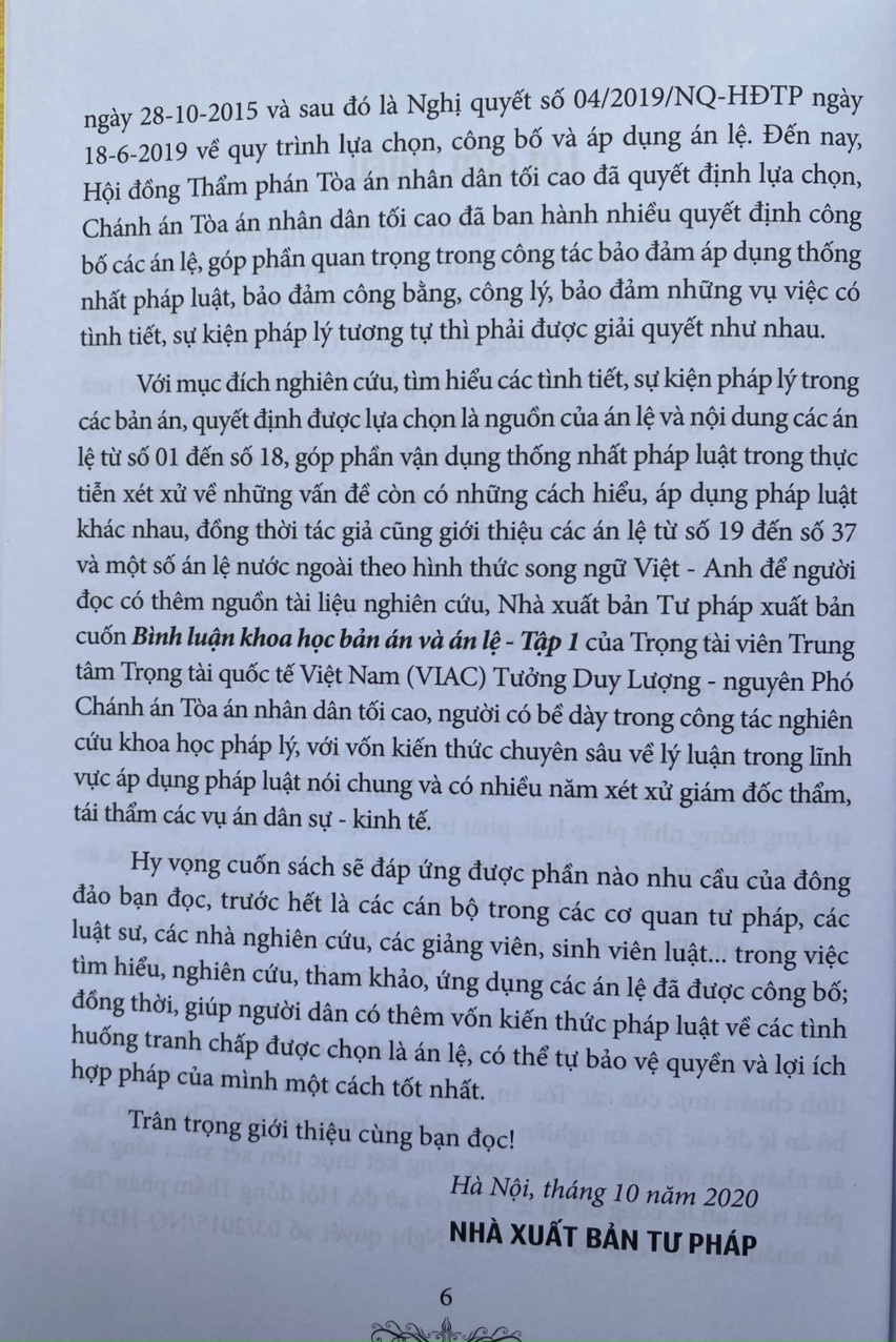 Với mục đích nghiên cứu, tìm hiểu các tình tiết, sự kiện pháp lý trong các bản án, quyết định được lựa chọn là nguồn của án lệ và nội dung các án lệ từ số 01 đến số 18, góp phần vận dụng thống nhất pháp luật trong thực tiễn xét xử về những vấn đề còn có những cách hiểu, áp dụng pháp luật khác nhau, đồng thời tác giả cũng giới thiệu các án lệ từ số 19 đến số 37 và một số án lệ nước ngoài theo hình thức song ngữ Việt - Anh để người đọc có thêm nguồn tài liệu nghiên cứu, Nhà xuất bản Tư pháp xuất bản cuốn Bình luận khoa học bản án và án lệ - Tập 1 của Trọng tài viên Trung tâm Trọng tài quốc tế Việt Nam (VIAC) Tưởng Duy Lượng - nguyên Phó Chánh án Tòa án nhân dân tối cao, người có bề dày trong công tác nghiên cứu khoa học pháp lý, với vốn kiến thức chuyên sâu về lý luận trong lĩnh vực áp dụng pháp luật nói chung và có nhiều năm xét xử giám đốc thẩm, tái thẩm các vụ án dân sự - kinh tế.